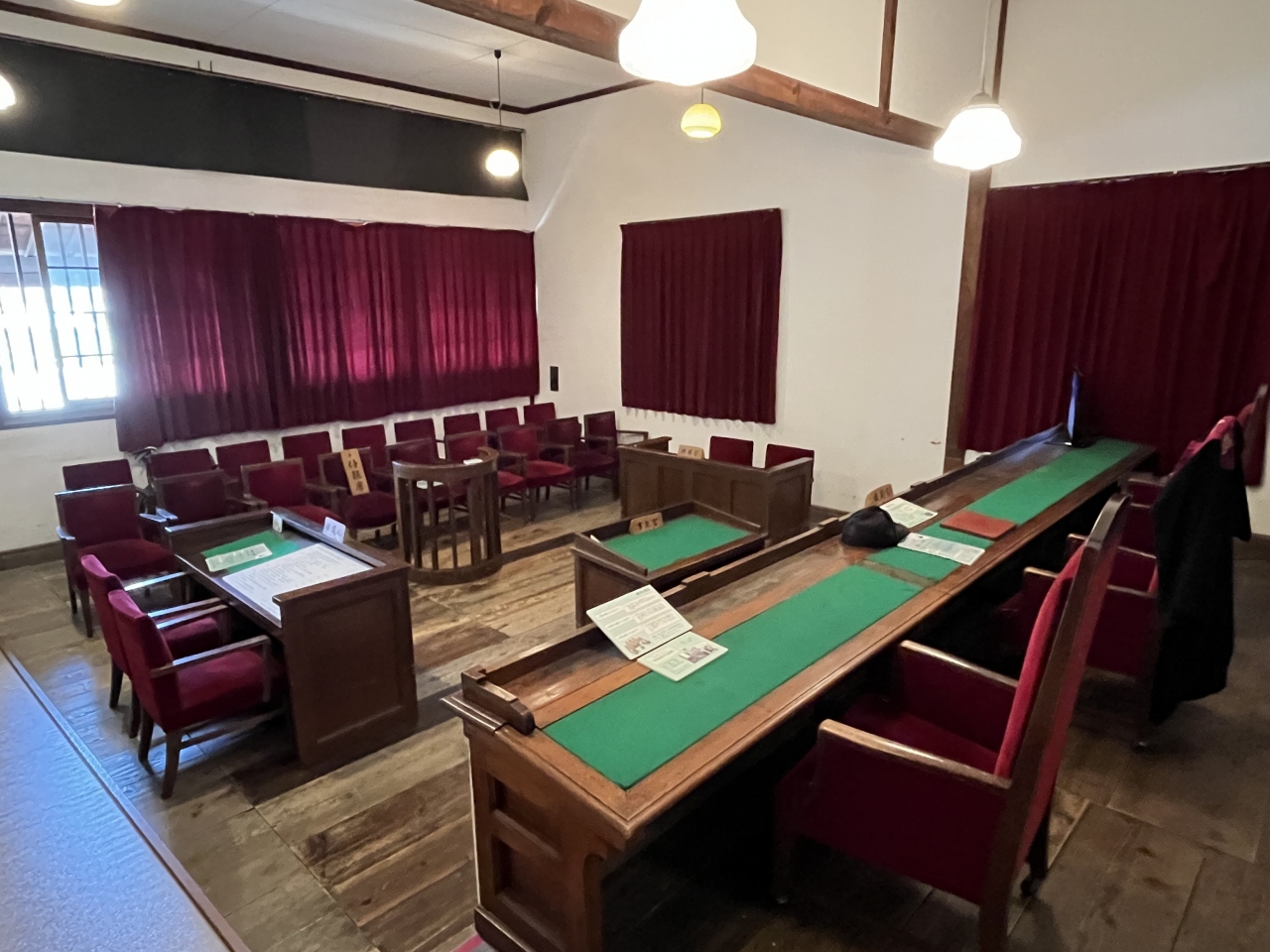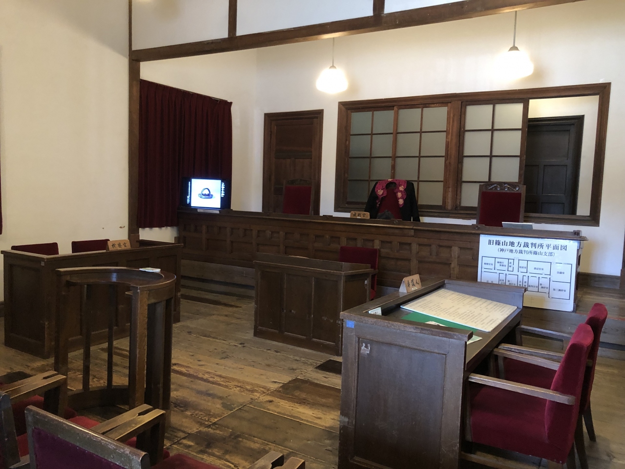 篠山城大書院などとの4館共通入館券を購入して訪問しました。明治時代に建てられた歴史的建造物で、昭和56年まで篠山地方裁判所として使われていたそうです。現在は、歴史美術館として、美術品が展示されているほか、当時の法廷がそのまま保存されています。裁判官席などに座ることができ、衣装も用意されていて、裁判官になりきることができます。