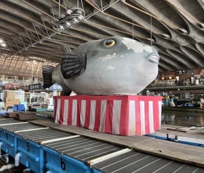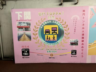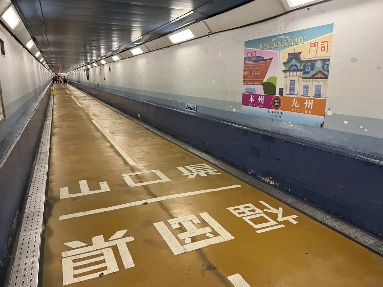 関門海峡を、関門橋、関門トンネル(車道)で通りましたが、せっかくなら歩いても渡ってみたいと思い、関門トンネル人道へ行きました。関門トンネルの上が車道、下が人道になっています。歩行者は無料、自転車、原付は20円でした。トンネル内に、福岡県と山口県の県境があります。人道内は緩やかな坂道になっていて、ちょうど県境のあたりが一番深いポイントになっていました。