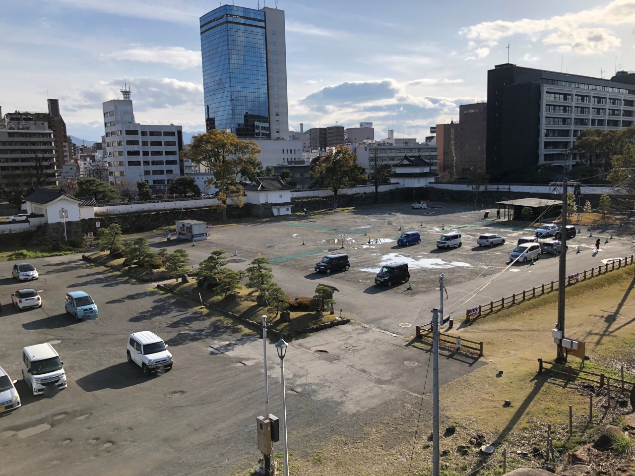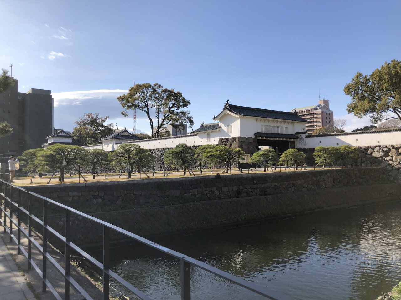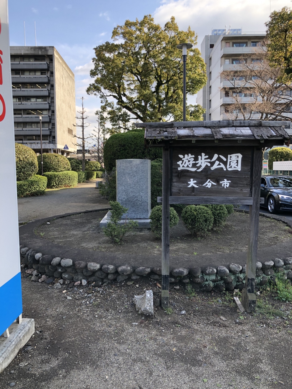 府内城跡を含む一帯が、大分城址公園として整備されています。大手門側から入り、園内をゆっくりと散策しました。石垣の上からは、城跡一帯を臨むことができてお勧めです。周辺には県庁や県警本部など、行政の中心機関が固まっています。