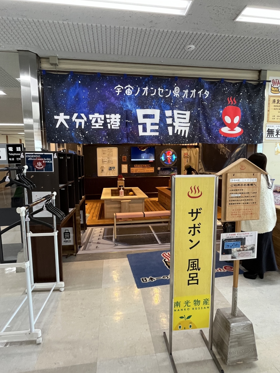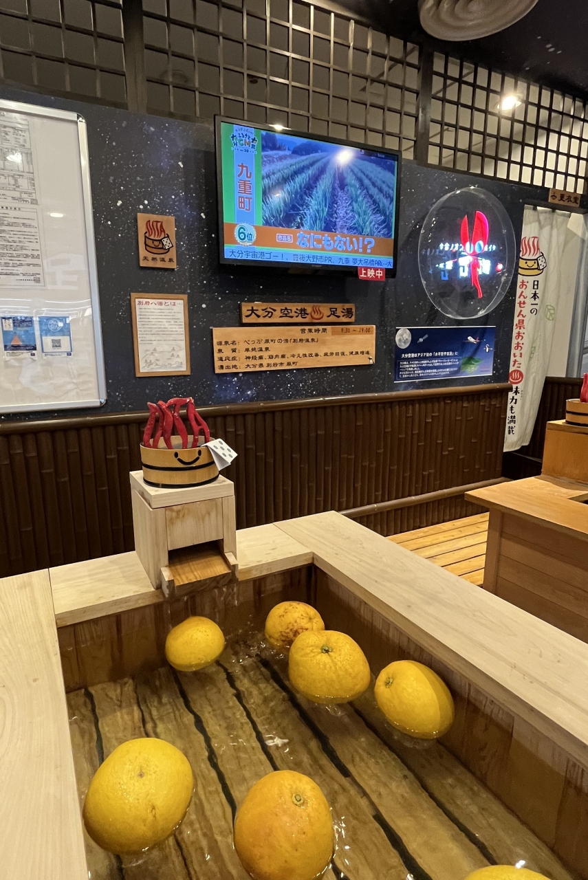 大分空港1階の到着ロビーにある足湯です。誰でも無料で利用できます。期間限定で、「イベント足湯」も開催され、この時はザボンが浮いていました。大きなザボンに驚くとともに、香りも楽しめて良かったです。おんせん県大分らしいお勧めスポットです。