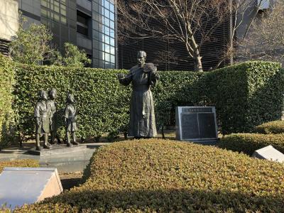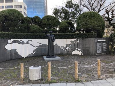 遊歩公園にある彫刻群の一つですが、少しわかりづらい場所でした。道路を挟んだ反対側にあり、大手公園前と言ったほうがわかりやすいと思います。十字架を持って宣誓するシンプルな像です。背景には世界地図が描かれ、ザビエルの足跡がよくわかります。