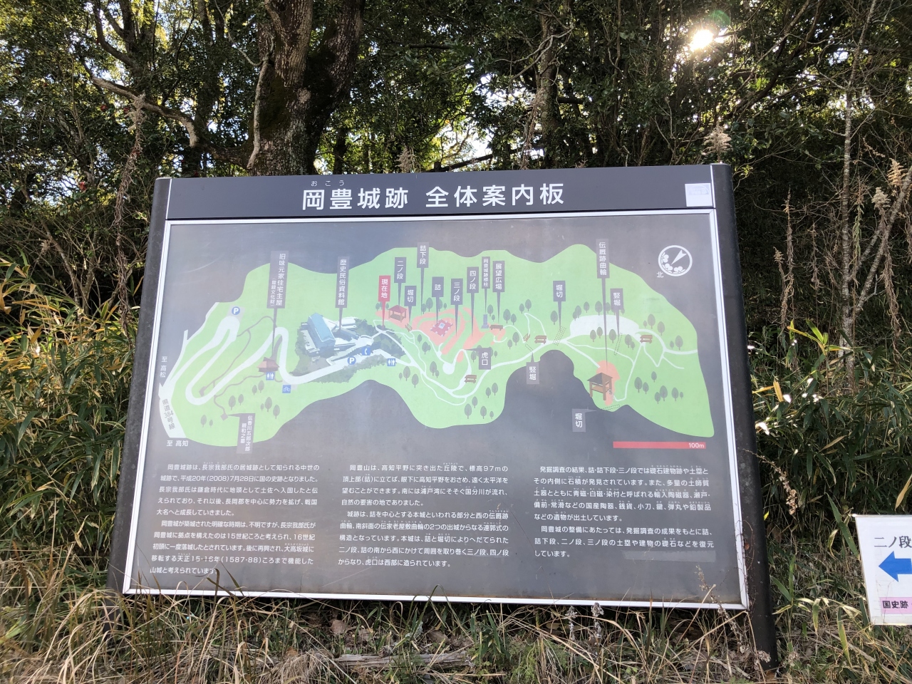 岡豊城跡がある岡豊山一帯が公園として整備されています。公園の一角には、高知県立歴史民俗資料館がありました。資料館の前にある階段を上ると、遊歩道が整備されています。遊歩道は、岡豊城の遺構を巡れるようになっているので、歴史に触れながら散策できます。