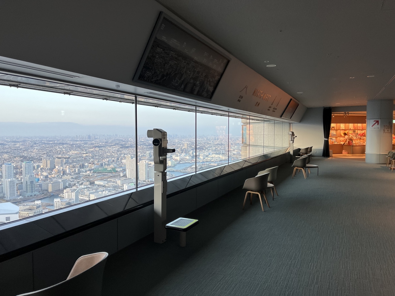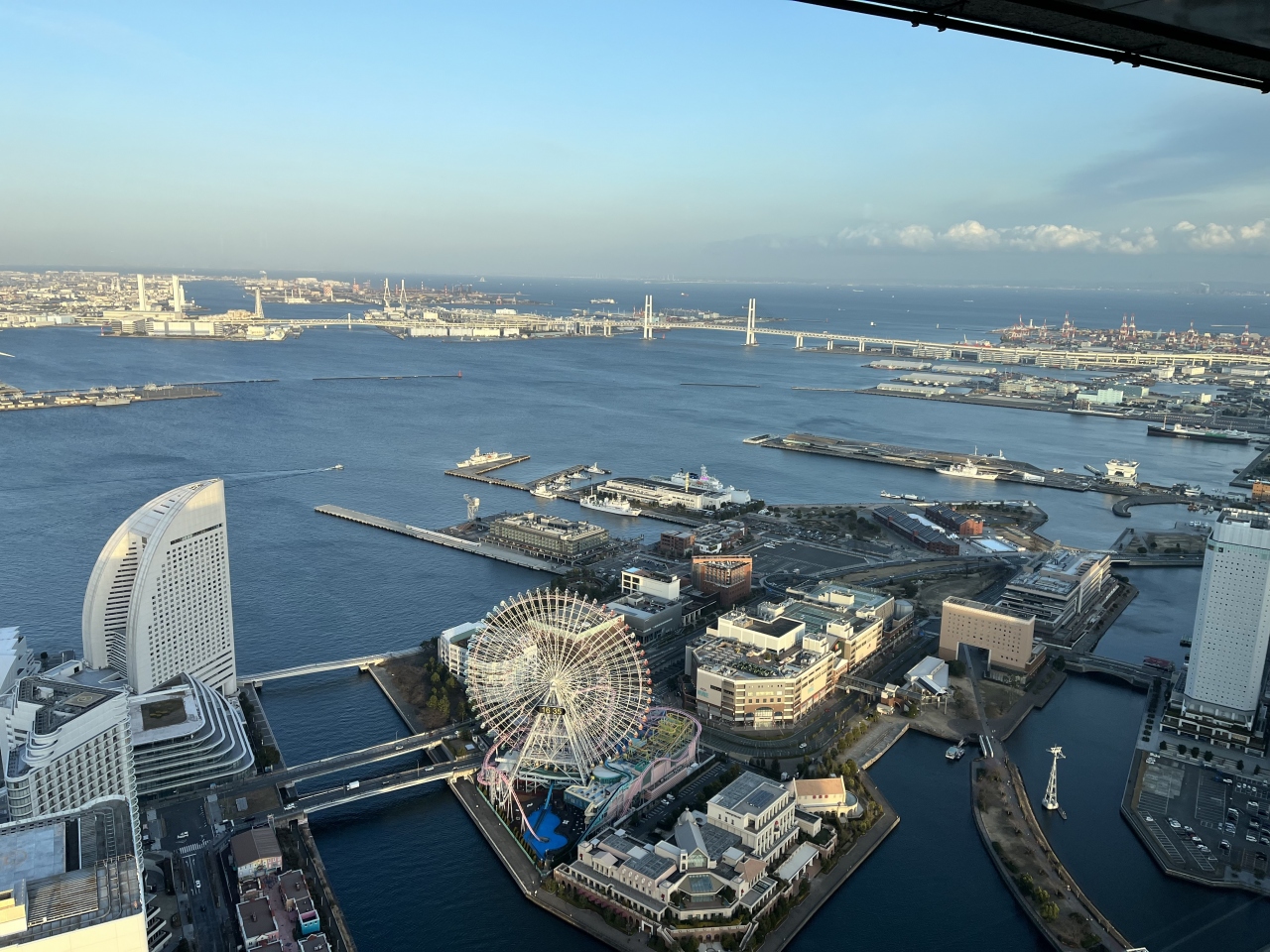 横浜ランドマークタワーの69階です。平日だったためか、それほど混雑はなかったです。入場料は、通常1,000円ですが、誕生日当日は無料で利用できます。また、同伴者にも割引サービスがありました。みなとみらいを眼下に、360度の景色を楽しめます。今回は、少し雲が多くて、富士山が見えなかったのは残念でした。展望室内には、ショップもあり、お土産が購入できます。