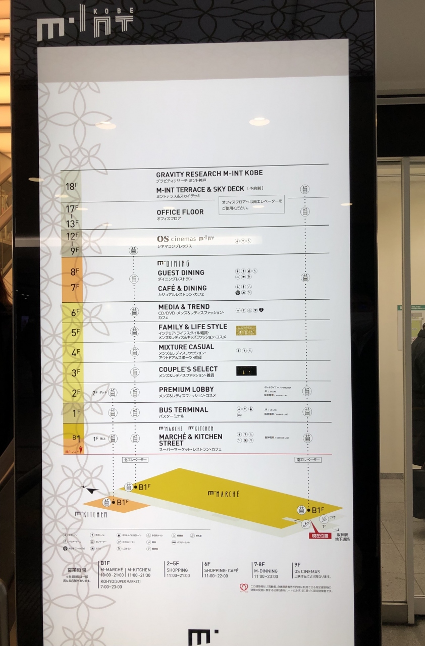 ミント神戸の一階です。ホテルオークラ神戸に宿泊した際、シャトルバスの発着がこの三宮バスターミナルでした。オークラ以外にも、いくつかのホテルのシャトルバスの発着所になっており、大変混みあっていました。その他、長距離バスも出る大きなバスターミナルですが、電光掲示板もあって案内はわかりやすかったです。