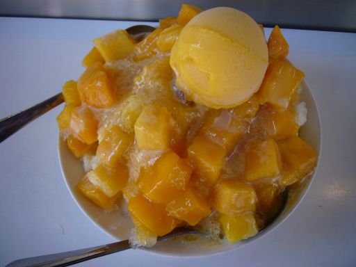 評判の高いマンゴーかき氷を注文してみましたが、一口食べたらそのとろけるような甘さに驚きました。日本でもスーパーで普通にマンゴーを買えるようになりましたが、それとは甘さがちがいます。