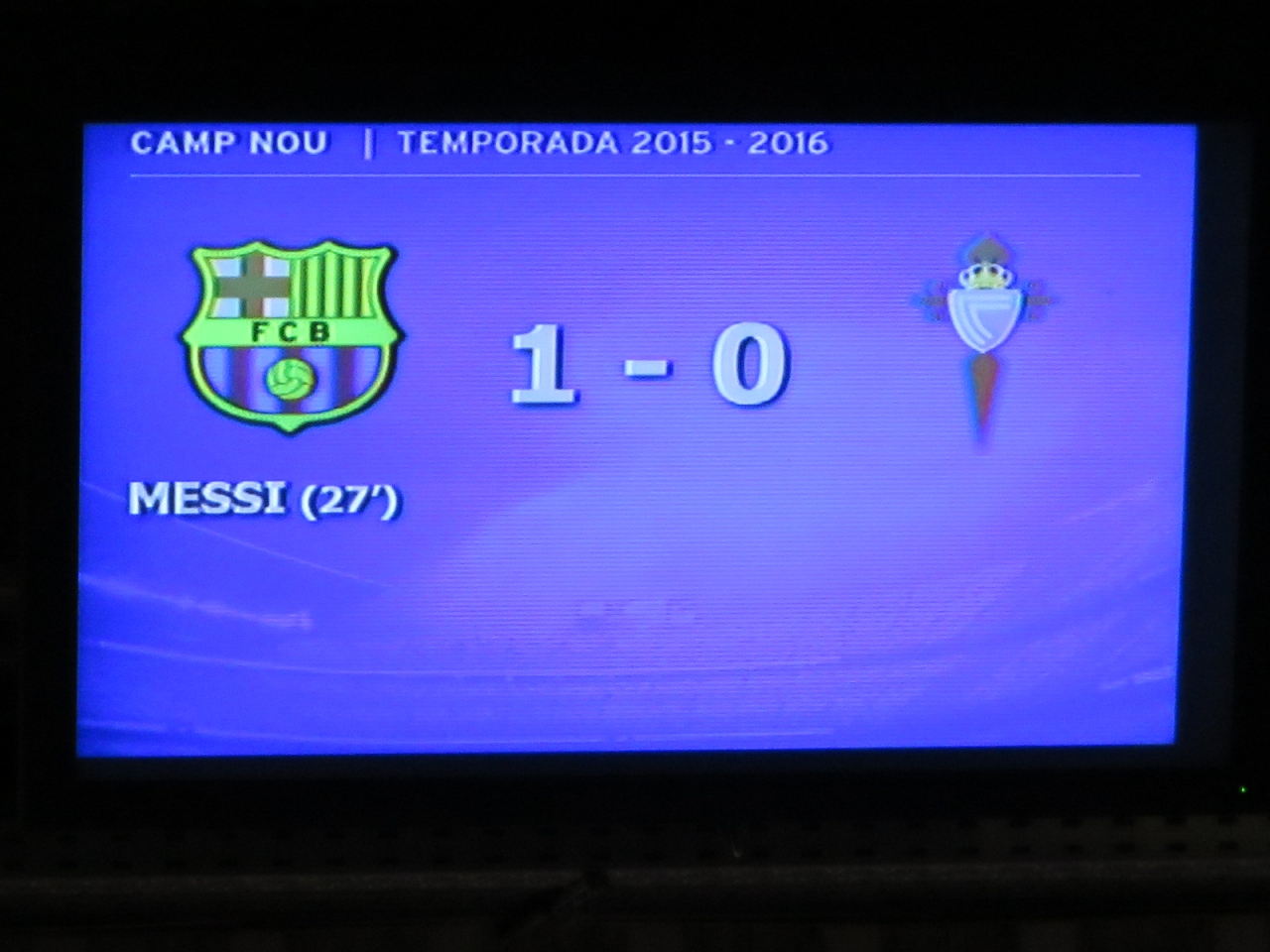 バルサは、左から右へ攻めます、前半は手前のタッチライン沿いにメッシが走っていました、試合は、メッシのFKによる先制点、ネイマール、そしてスアレスのハットトリックでバルサが勝ちました。スアレスの3点目は、メッシのトリッキーなPKによるプレゼント・ゴールでした。(私は、後半戦は観ることができませんでした、残念)