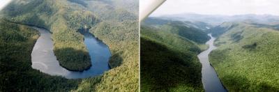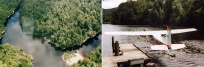 程なくゴードン川の流入部に達し、川の流れに沿って遡っていきます。周囲はヒューオン松を含む森林帯が拡がっています。眼下には、馬蹄型に流れるホ-ス・シュー・ベンド、溶けた金属が流れる様だというキル・リーチ(Kiln Reach)など見てから、流れから外れてエリオット高原(Elliot Range)を巻く様に飛んだ先で、フランクリン川の合流点が見えました。その先で川幅がぐっと広がります。ジョン卿滝エリヤになりましたので、飛行機は高度を落とし、流れに沿って右へ左へと飛び、川筋が3~400mくらい真っ直ぐとなったところへ着水します。波がまったくありませんから誠に静かな着水です。上流側へ戻り、左岸に作られたデッキ(クルーザーと共用)に接岸しました。