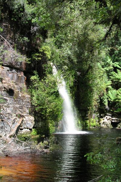 ここは河口から35km上流に当たりますが、標高は50mほどしかないとのことです。上空から見る水の色はタンニンなどが溶け込んで黒い色に見えましたが、近づいて見ると濃いコーヒー色をしています。肝心のジョン卿滝(Sir John Falls)ですが、ちょっと奥まったところにあるので、木道を辿り、ほんの1、2分で見えてきました。滝はカタラクト川(Cataract creek)に懸かっていて、高さは33m~34mの間だそうです。そこそこに水量があり美しい姿をしています。でも、Fallsと複数形になっていますから、ここからは見えない滝の上部にも続きがあるのでしょう。しばし休憩の後、再び搭乗して、ほぼ川筋上空を辿って戻りました。