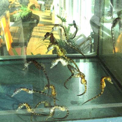宿屋の場所は番所鼻自然公園にありました。ここは伊能忠敬が「天下の絶景」と絶賛したほどの場所(その石碑が建っていました)だそうで、部屋からも秀麗な開聞岳が夕景、日の出と眺められました。すぐ近くにはタツノオトシゴハウスがあり、無数の竜の落とし子に出会うことも出来、立地は文句なしでした。料理はもちろん伊勢海老づくしで、これで温泉があったら文句の付けようのないところでした。余談ですが、夜中に眺めた満天の星も感動ものでした。(なかなか普通のカメラでは全部は撮れないですが・・・)