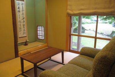 別棟の元茶室をリノベーションしたという客室を利用しました。雨だったので、本館レストランに通じる渡り廊下側から入室しましたが、普段は表にある格子戸のある門を利用するそうです。部屋は5つほどあり、合わせると20畳以上はありそうでした。お庭は広い本格的な日本庭園で、独り占めするには勿体ない感じがしました。部屋にはお風呂が付いていましたので、こちらも温泉を独り占めで堪能できました。