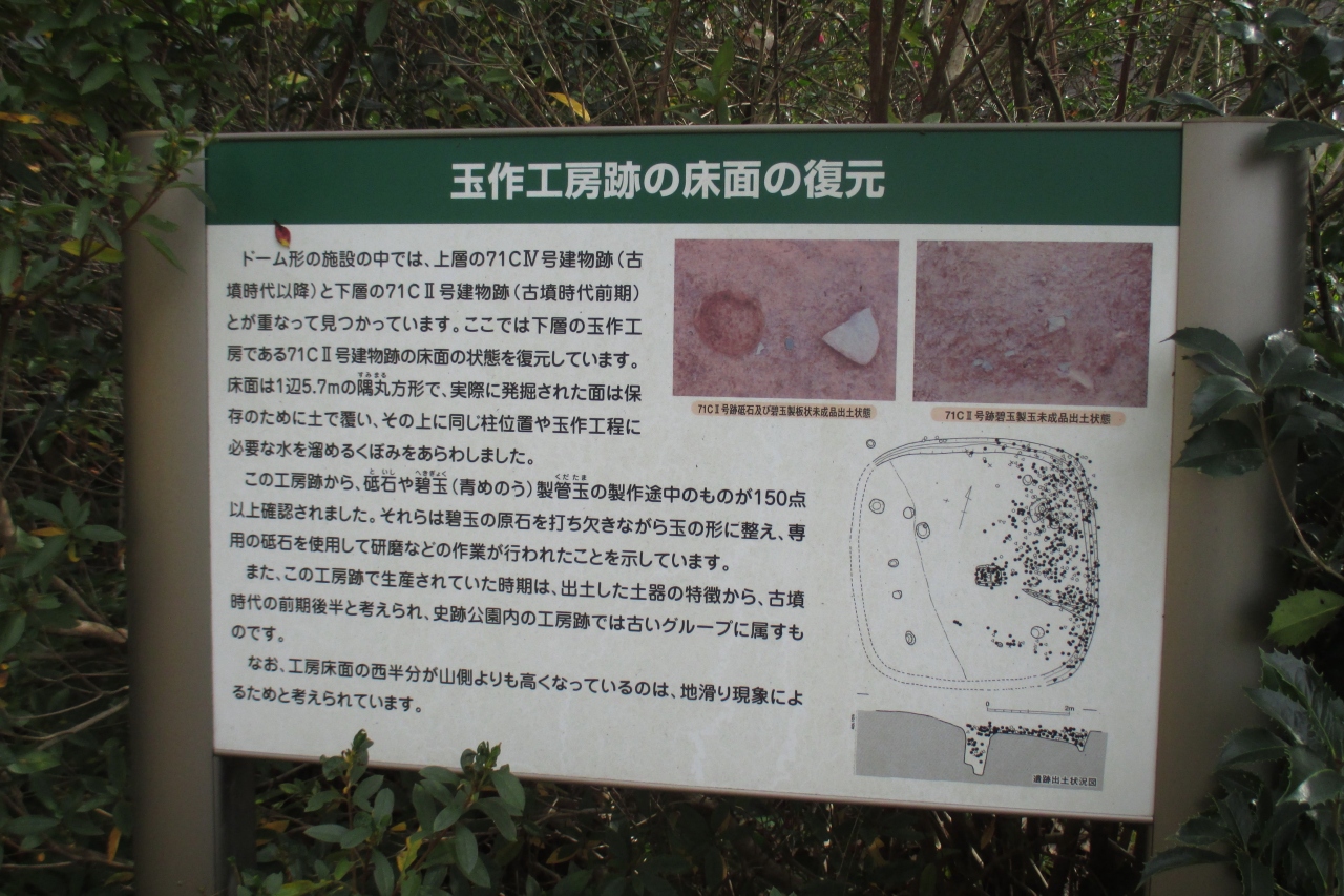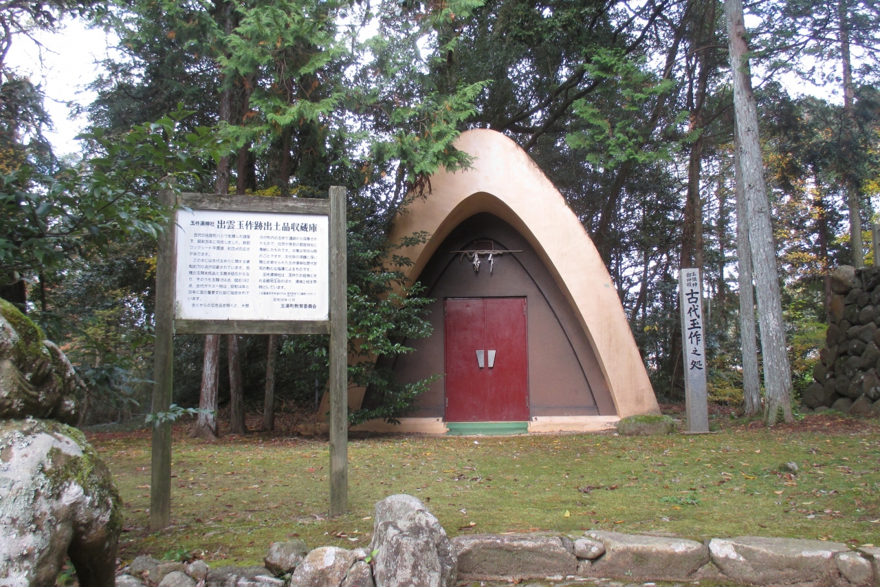 玉造温泉の温泉街が南に出外れたところに、玉作湯(たまつくりゆ)神社がありました。創建は不明とのことですが、733年(天平5年)の創建とも伝わっているそうです。ご祭神は勾玉造り系の櫛明玉神(くしあかるたまのかみ)と温泉系の大名持神(おおなむちのかみ=大国主神)と少毘古那神(すくなひこなのかみ)の3柱となっています。この町の歴史をそのままに祀っていることになります。その勾玉造りに関連して、境内に古代の住居の形をした収蔵庫があり、玉作跡から出土した玉類や砥石などを収納しているとのことです。