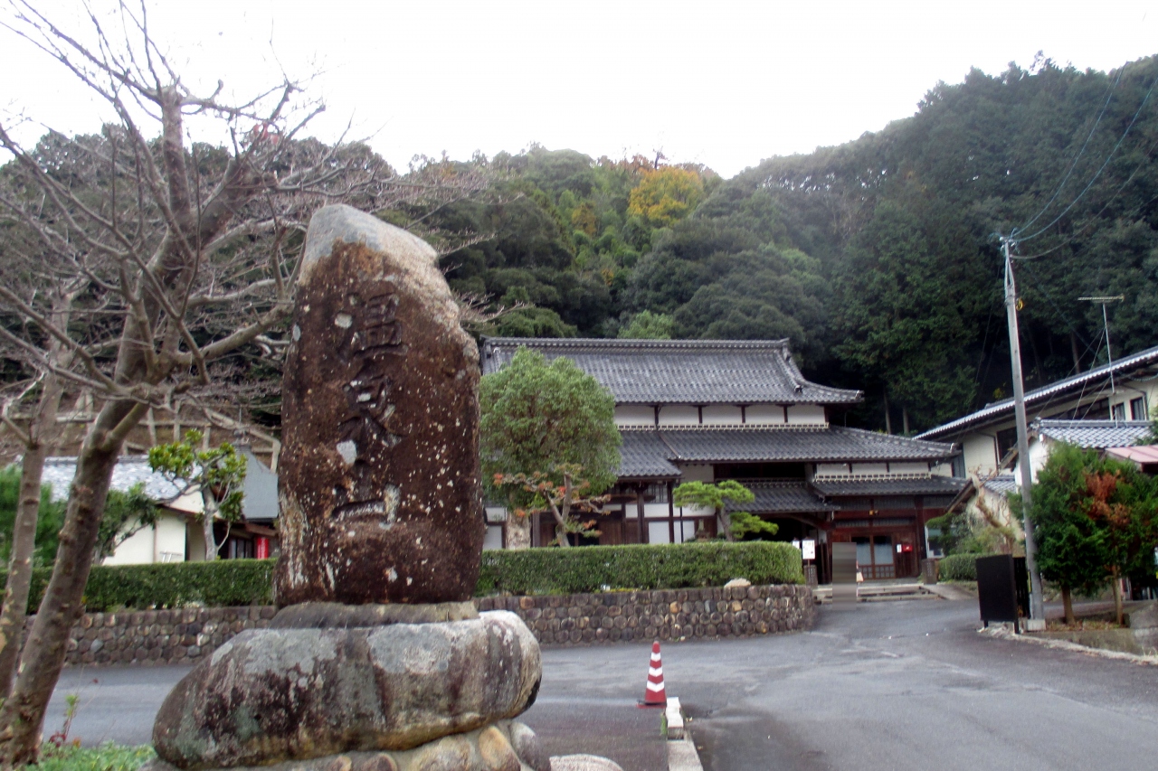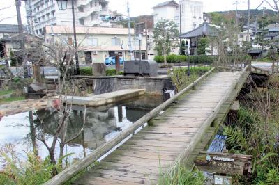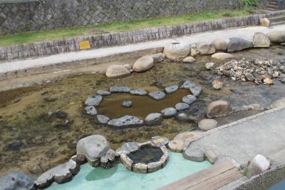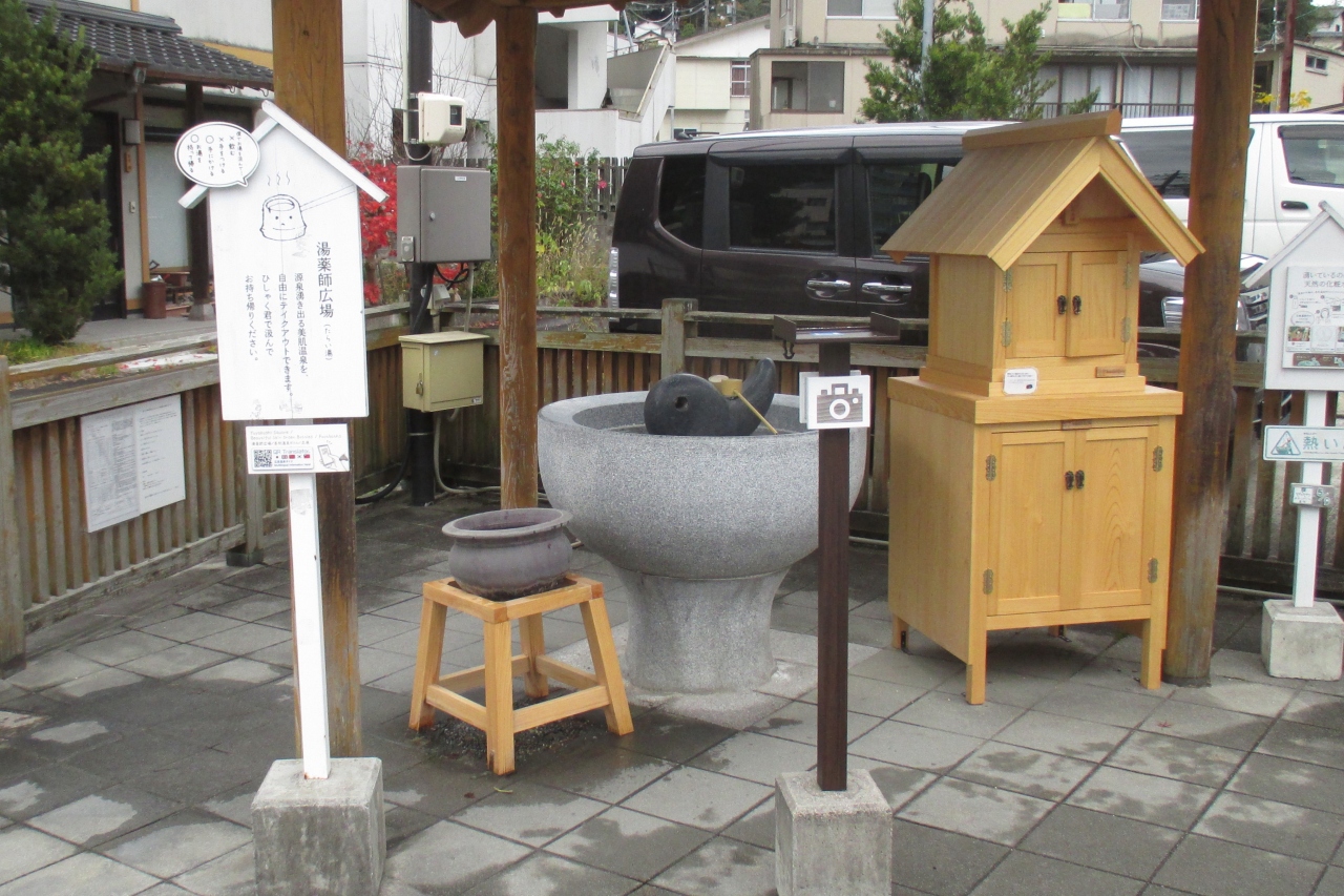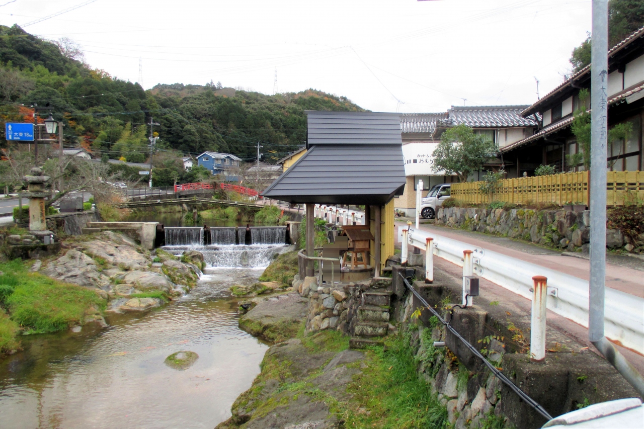 湯町八川往還が県道25号線に合流する直前のところに、湯薬師広場たらい湯がありました。温泉が湧き出る石で造られた「たらい」に勾玉が浸かって?いました。ひしゃくが置いてありますが、この温泉は飲用ではなく、手に掛けたり、また、入れ物に入れてテイクアウトするのだそうです。入れ物があればタダです。