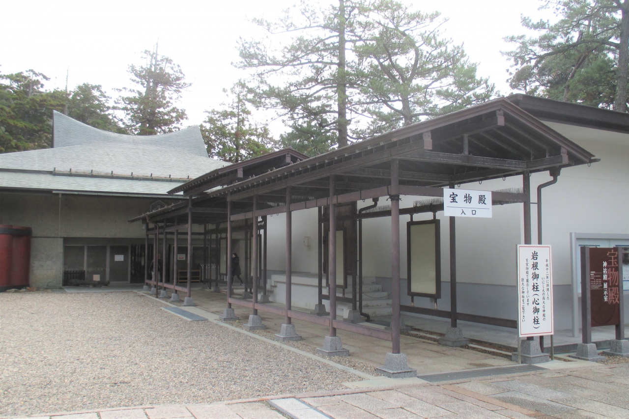 有名な出雲大社の割にはずいぶんと控え目と感じる宝物殿がありました。入口には、「岩根御柱(心御柱)展示中」となっていました。この宝物殿の名称は「神祜殿」というのだそうです。そもそも神祜とはどんな意味?がわりませんねぇ。後でHPを見ると「神の助け」、「神から幸を授かる」という意味なのだそうです。読んでも、よく分りませんが、今、最大の売りは心御柱ということです。そもそも出雲大社の社殿はとてつもない高さがあったといわれていますね。それが平成初期の発掘調査で、西暦1300年前後の鎌倉時代の柱が出てきて、それが確かめられたのです。ここまでやったら、古代は天を突く高さがあったそうですから、復元してほしいと思いますねぇ。なお、八足門の前には発掘したときのイメージが残されていました。