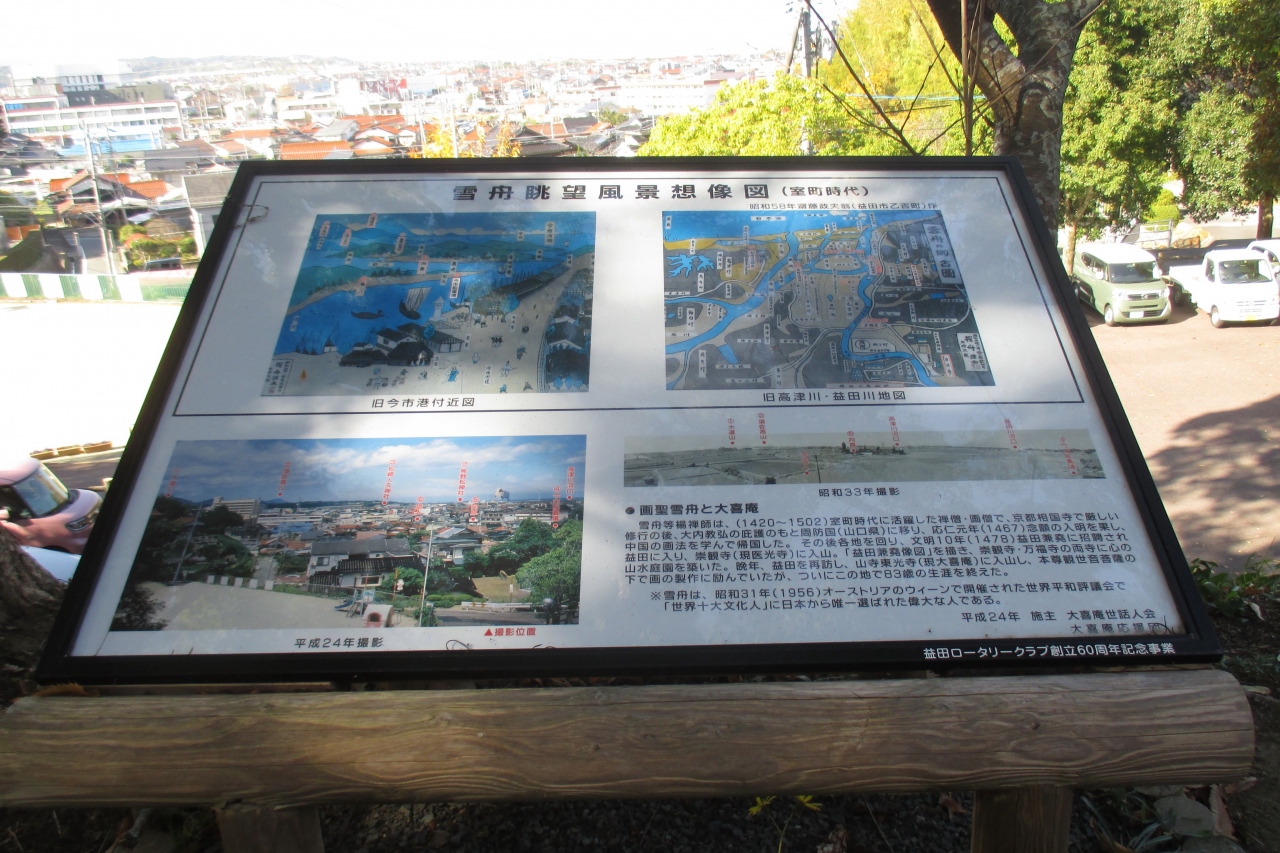 益田には、雪舟に関連する大喜庵、伝雪舟の墓、雪舟の郷記念館が集まっているところを雪舟山水郷という呼び方があるそうです。その雪舟山水郷は国道9号線の交差点・乙𠮷東辺りで南東に見える低い丘陵でした。元々、大喜庵の場所には、16世紀初めには益田氏の菩提寺だった東光寺があった(益田氏はたびたび菩提寺を変えています)とされていて、雪舟は晩年となる1502年(文亀2年)からそのお寺を生活の拠点とし、1506年(永正3年)に亡くなったそうです。