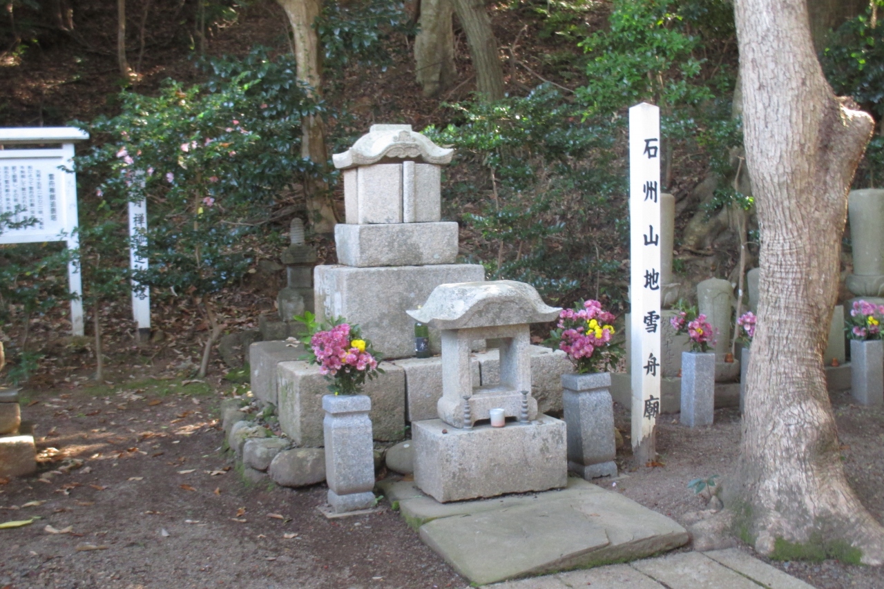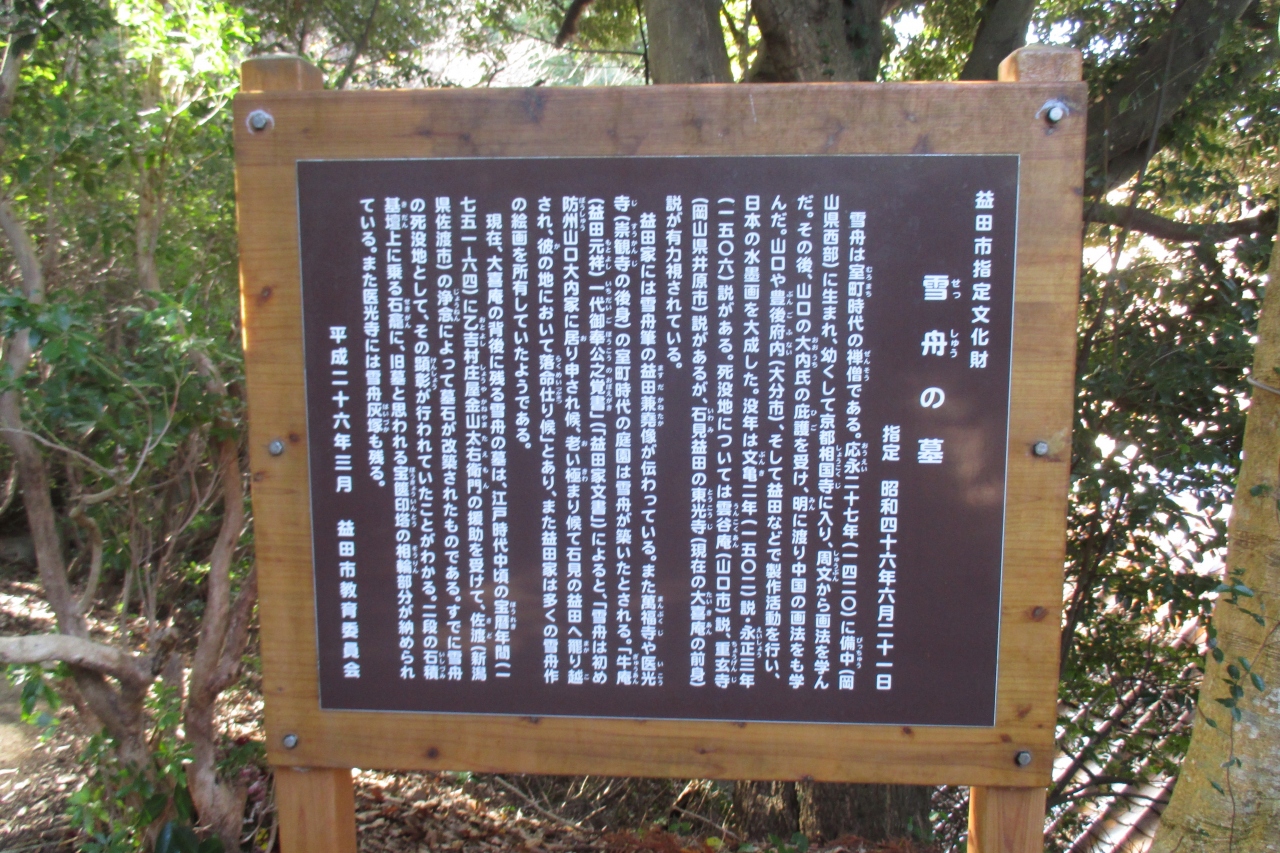 墓所への入口に「画聖雪舟禅師終焉地碑」と刻まれた石碑がありました。これも没後500年記念事業として、2005年(平成17年)に建立されたものだそうです。良く見ると、中国寧波天童禅寺方丈誠信書と刻まれていました。雪舟が中国の明に渡った時に、禅の修行をした天童寺の163世住職の誠信さんの揮毫なのですね。益田市と中国寧波市とは雪舟の縁で姉妹都市だそうです。- 旅行時期