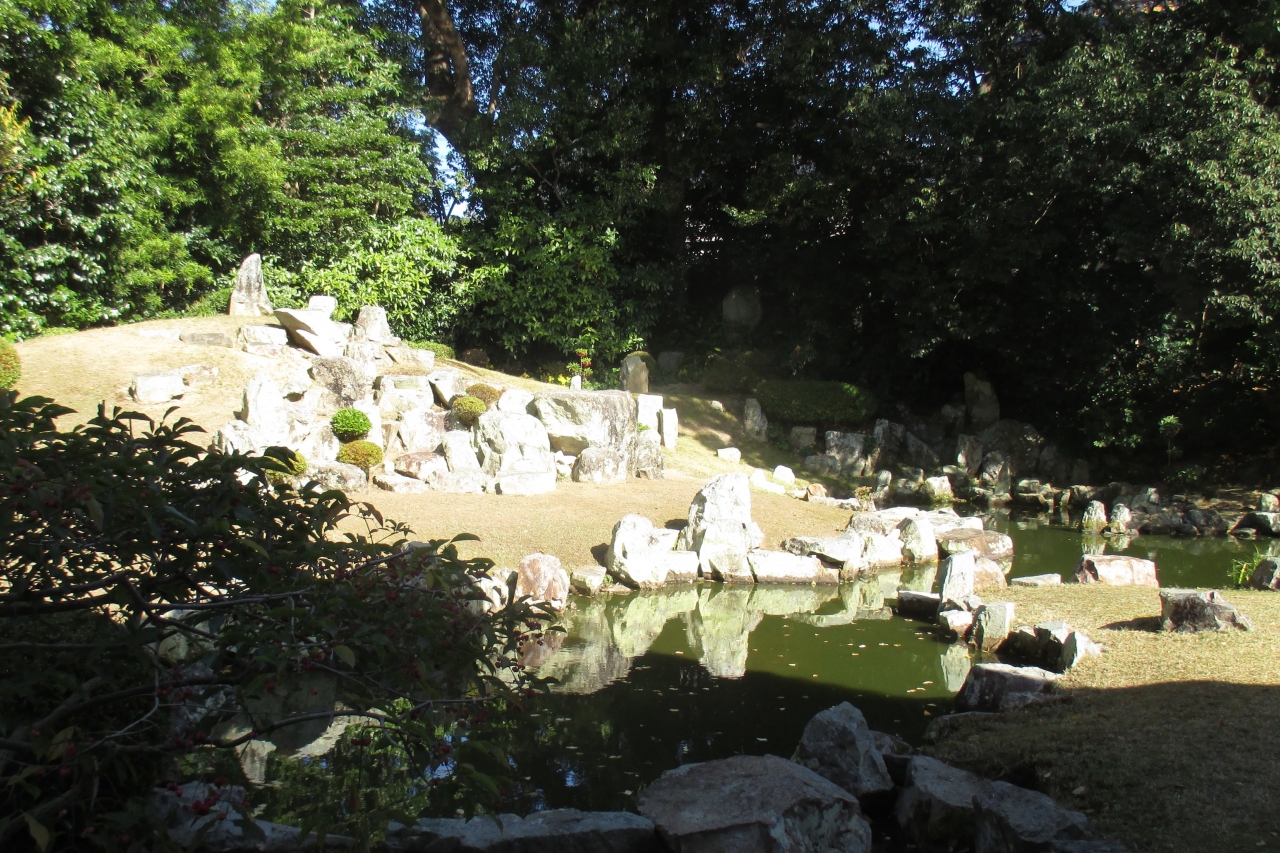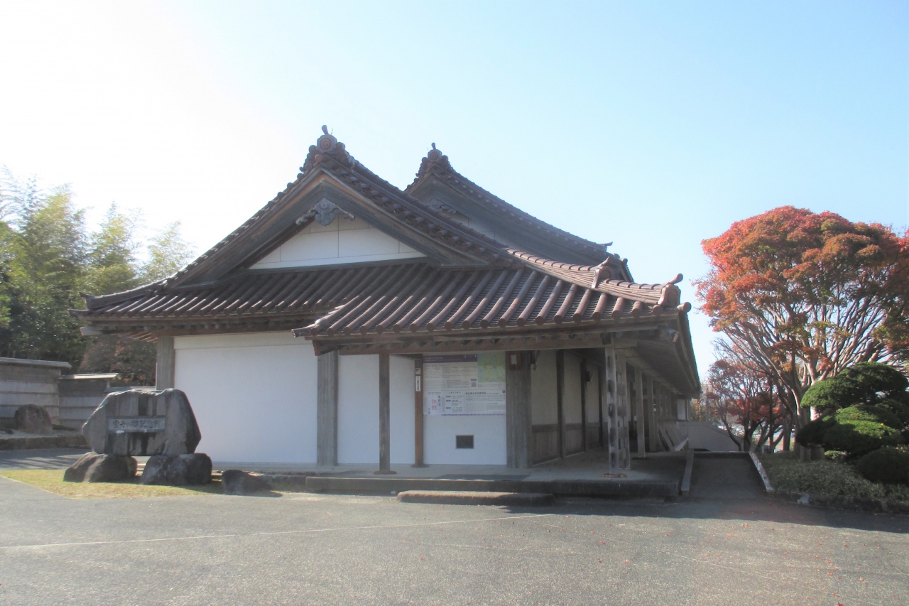 雪舟山水郷の一画に、雪舟の郷記念館がありました。場所は、雪舟の墓の後ろの低い丘の先といったところです。雪舟や益田家に関する資料を展示しているこの記念館ですが、1990年(平成2年)に開館しています。「雪舟の益田」の切り札?として、前年にふるさと資金を使って、雪舟の「益田兼堯像」を購入したことがきっかけだそうです。(現在は年2回公開されるそうです)建物は中世寺院をモデルにしたもので、茶色の瓦葺きは雪舟縁の、中国寧波天童寺を模したのだそうです。作庭の名手でもあった雪舟を偲んでか、お庭「八景園」が造られていました。