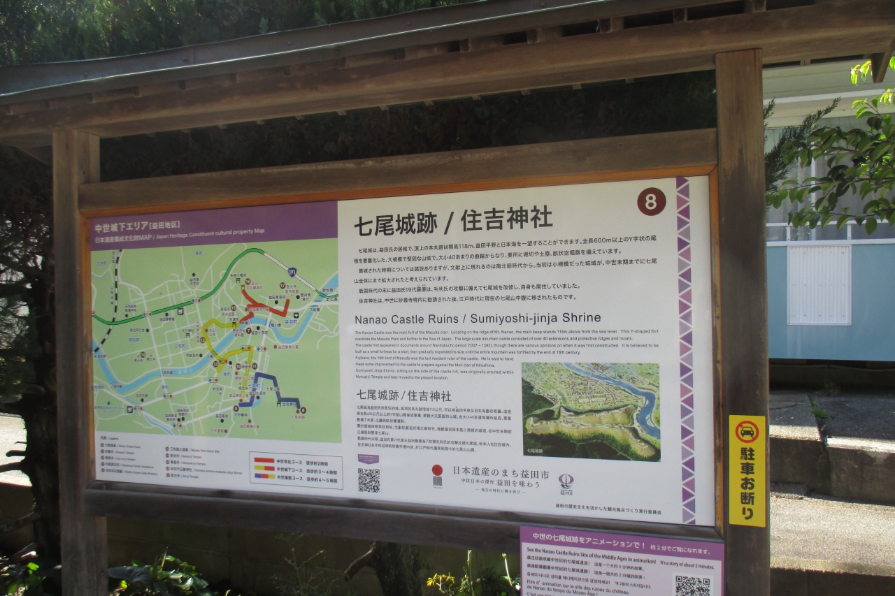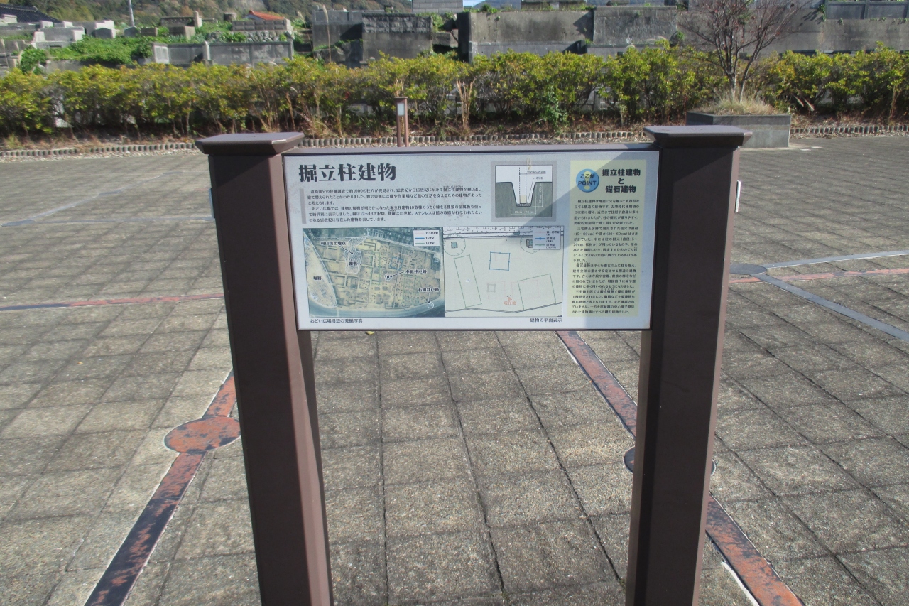 雪舟の郷記念館から益田川方面へ南に進み、県道171号線沿いに三宅御土居跡がありました。ここは益田氏の城館跡と見られているところです。なお、県道171号線は七尾城通りとの愛称が付いているそうです。七尾城跡は益田川を越えた先の小山の上ですから、平常時は平地のここに館を構えていたとなります。城館の敷地はかなりゆがんでいますが、広さはおおよそ190m×110mほどの広大さで周囲を土塁(御土居)で囲んでいました。その周りには濠を築いてありましたが、益田川はその濠の一部を担っていました。道路横に「おどい広場」と名付けて整備されていました。屋敷跡からは約1、000個の掘立柱跡が見つかっているそうです。掘立柱とは建物の柱を直接地面に立てる建築方法だそうです。繰り返し、何度も建て替えられていたそうで、こんなに多くの跡が残っているのですね。種類の違う金属板で、年代別の建物跡が示されていました。