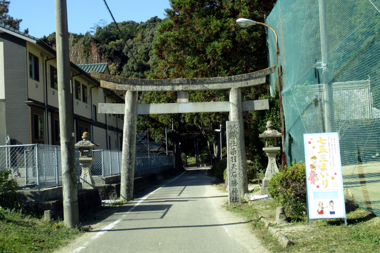 萬福寺の北東方向、直線で200mくらいのところに、染羽天石勝(そめばあめのいわかつ)神社がありました。創建は725年(神亀2年)と伝わり、大和の摂津からやって来てこの地方を開拓した春日族の始祖天石勝命(あめのいわかつ)を祀った神社とのことです。染羽(そめば)はここの地名です。この地の氏神として益田氏の手厚い庇護を受けたとのことです。