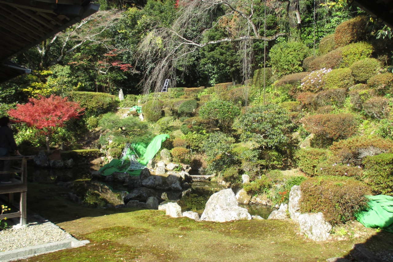 まずは道路近くに建つ大きな山門が目を惹きました。見上げるほどの風格のある門ですが、七尾城の大手門だったものだそうです。関ヶ原の戦い後、益田氏が須佐への転封時に下げ渡されたそうです。なお、屋根の形は後年、手が加わっているそうです。肝心の庭園ですが、15代城主の益田兼堯(かねたか)の招きにより、雪舟は1479年(文明11年)に益田にやって来ます。そして、益田滞在中に崇観寺の第5世の住職となり、塔頭に庭園を造ったとされています。現在のお庭は、1729年(享保14年)に医光寺を襲った大火後に再興されたものだそうですから、元の姿がどの程度残されているかとなりますね。それはともかくとして、本堂の裏手に廻ると、あちこちに養生シートが拡がり、梯子も放置されていました。せめて、受付で一言欲しかったなとブツブツです。ここは訪れたことに満足しておきましょう。続いて、本堂に廻り、ご本尊の薬師如来像をお参りしました。境内には雪舟灰塚がありました。東光寺でなくなった雪舟は、以前に住職を務めた崇観寺で荼毘に付されたと伝わっていて、その場所がこの灰塚だということです。なお、山号は瀧蔵山で、臨済宗東福寺派のお寺さんです。- 旅行時期