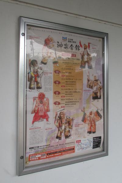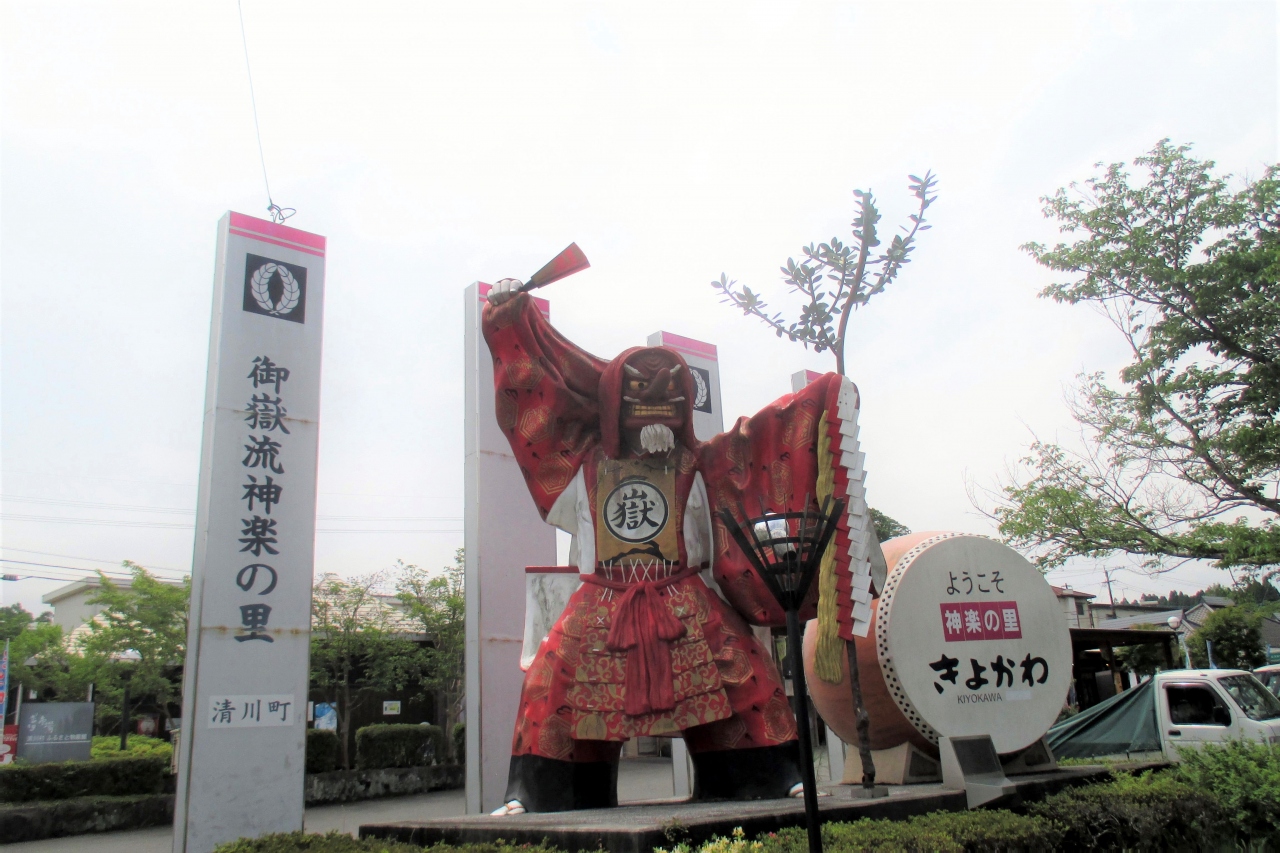 道の駅・きよかわと同じ敷地に豊後大野市神楽会館がありました。道の駅兼用の駐車場の入口には大きな神楽の像がありました。毎月1回の公演が行なわれていて、訪れた時は当月公演が終わった直後で残念ながら見られませんでした。入場料金は当日売り1、500円、前売り(2ヶ月前から)1、000円です。なお、前売り券の販売は神楽会館のみとなっていました。今年上半期の公演内容を見ると毎月違っていて、地元清川の御嶽神楽を始め、御嶽流奥畑神楽、重岡岩戸神楽保存会、柴山八幡社付属柴山俚楽、國分神楽社、深山流朝地神楽保存会、御嶽流吉田俚楽座、浅草流松尾神楽、竹の中神楽座、浅草流黒松神楽、二豊神楽社と各地のものが組み合わされていました。また、下半期を見ても各地の組合わせで、上期を重なるのは御嶽神楽だけでした。なお、俚楽とは、緒方町に伝わる神楽や獅子舞などの伝統芸能を表わす呼称とのことです。