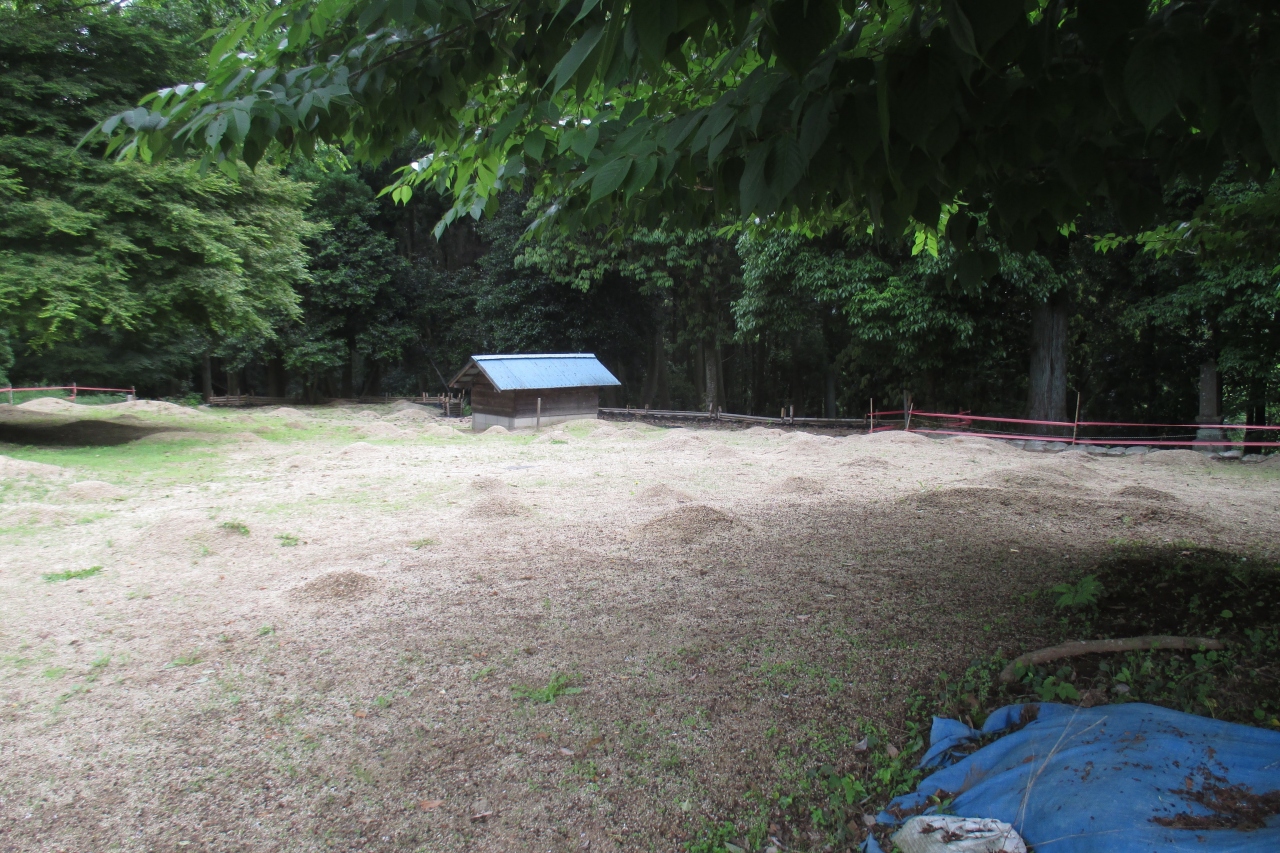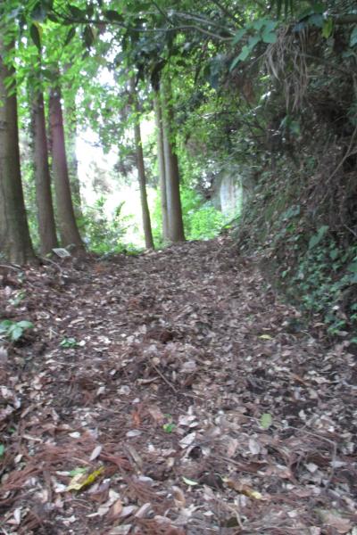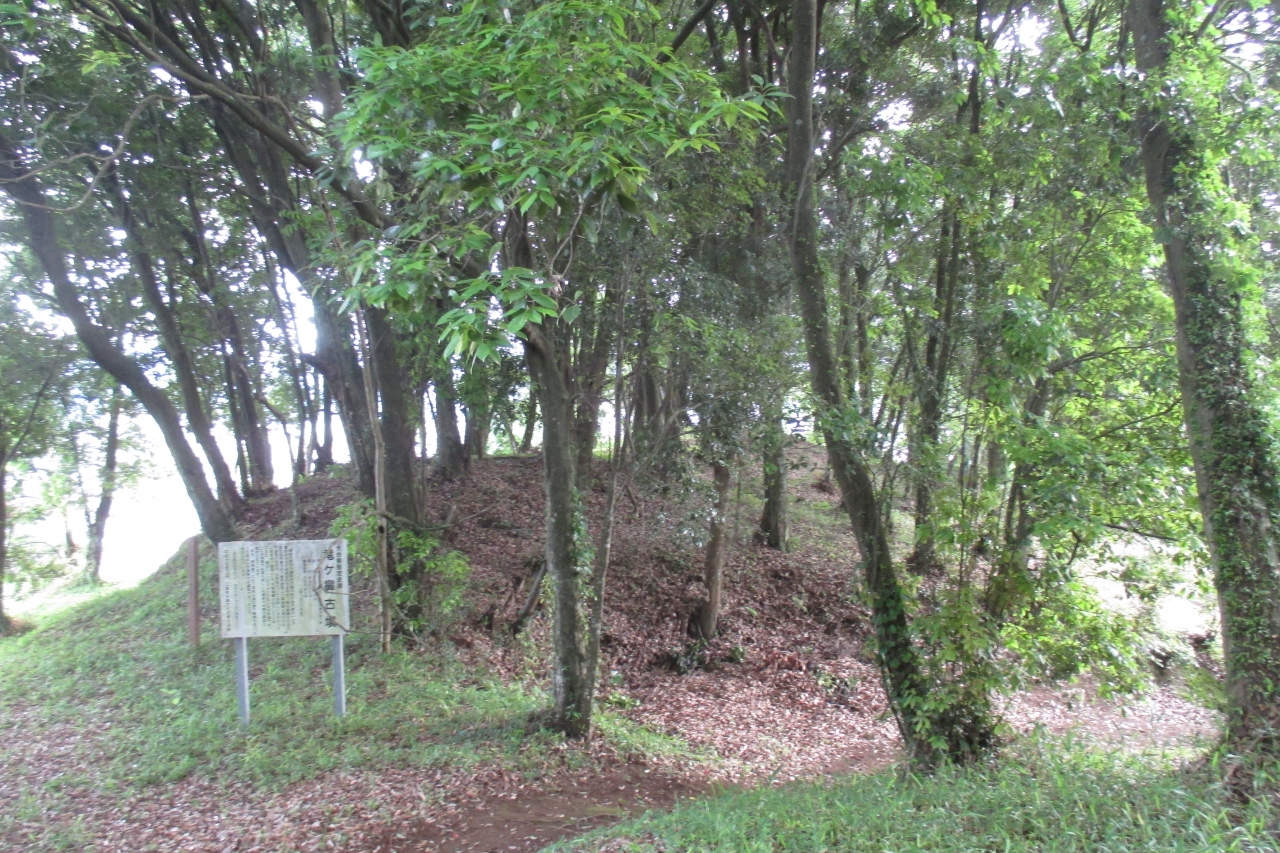 ツツジの大原公園の上は広場になっていて、東端には慰霊塔が建っていますが、反対の西端の公衆トイレの横の下り坂を降りたところに竜ヶ鼻古墳がありました。小振りな前方後円墳で、降りたところが後円部で、案内板が立っていました。全体は形がかなり崩れてしまっていますが、全長は約35mです。後円部は径が約18mで、高さが約3m、前方部は長さが約17mで、高さが1.5~2mです。築造は5世紀後半とみられるそうです。小型の古墳ですが盗掘に遭っているそうですね。後円部の上が窪地になっているところがその跡だとか・・・。前方部の上には小さな石祠が置かれていました。なお、ここは個人の所有だそうです。