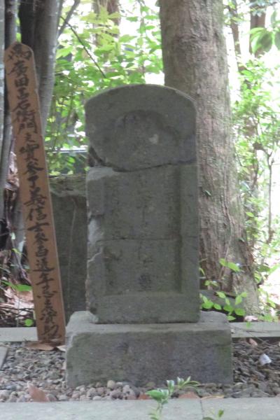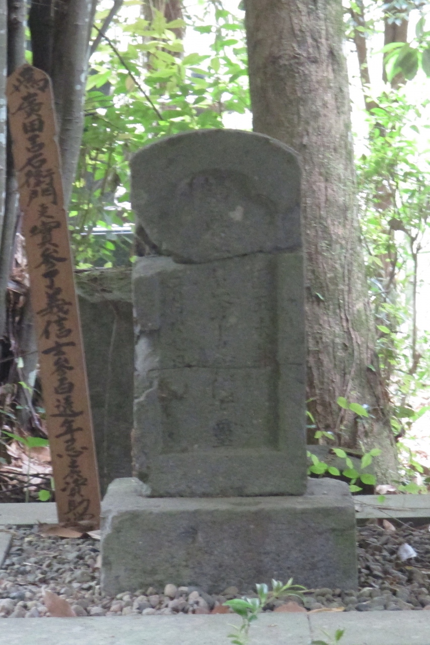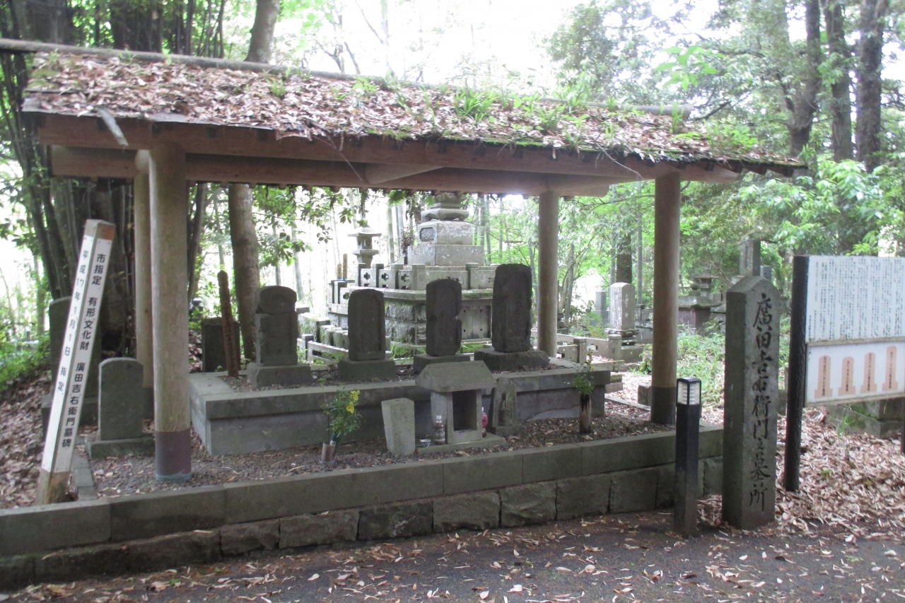 吉四六さんのお墓は、普現寺境内のもみじの林の中にありました。北参道といった小道沿いに「廣田吉右衛門之墓所」の標石がある覆い屋の下に4つの墓碑が並んでいました。2つのひびの入った1番左が初代廣田吉右衛門さんのお墓で、その隣が奥さんのおへまさんのお墓とのことです。横に立つ卒塔婆には實参了義信士三百遠年忌と書かれていました。なお、おへまさんの戒名はが妙林禅定尼でした。