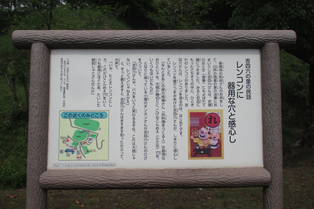 吉右衛門さんが鈍って吉四六さんになったそうですね。吉四六さんは1628年(寛永5年)生まれで、亡くなったのは1715年(正徳5年)とのことですから、88歳の長寿だったのですね。三百遠年忌は2015年(平成27年)に営まれたのでしょう。苗字、帯刀を許された弁指(豊後や日向地方で庄屋を補佐する村役人)の家柄で、屋敷は現在の臼杵市野津庁舎近くにあり、お墓もそこにあったそうですが、菩提寺である普現寺境内に移されたとのことです。(時期は不明です)