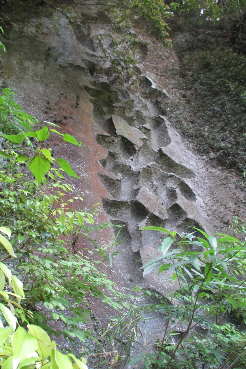 駐車場から、「大経文」の案内に従い、落葉が積み重なった道を進んでいくと、右の垂直の壁に六字名号がありました。六字名号は「南無阿弥陀仏」の6文字ですが、深々と彫り込まれていました。1753年(宝暦3年)に彫られたものだそうです。1文字が2m、全体で12mの高さがあります。岩壁直下の1人分程度の道幅から見上げると、何が書いてあるのかさっぱり分りませんでした。もう少し離れたところから見たいですね。- 旅行時期