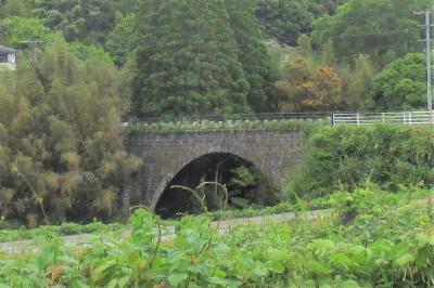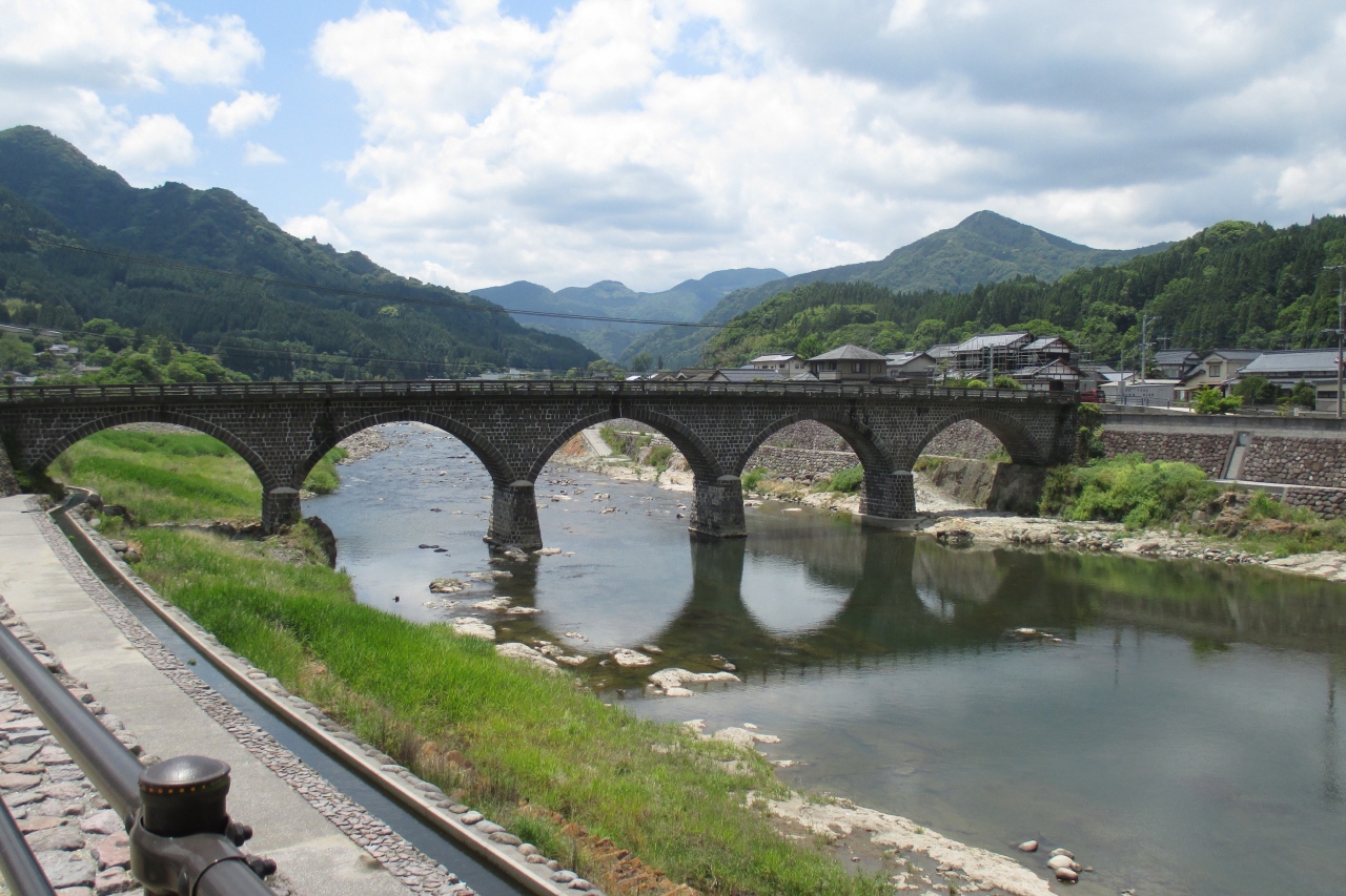 石橋としては大急ぎの再架橋で完結している様に見えるのですが、200mくらい下流のところに国道10号線の明治橋が架かっていました。その下流側に並行して鉄製の橋が架かっています。1902年(明治35年)に架けられた元の明治橋です。当時は国道36号線だったそうですが、主要国道に架けられた最新構造の橋だったはずです。この橋で充分だったはずなのに、何故、石橋をまた架けたのでしょうね。- 旅行時期