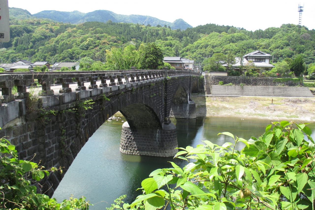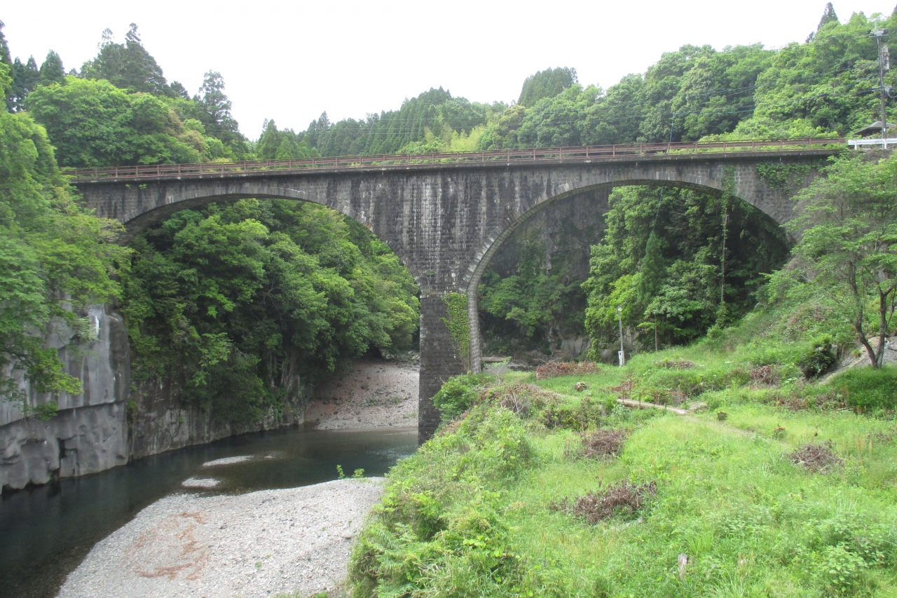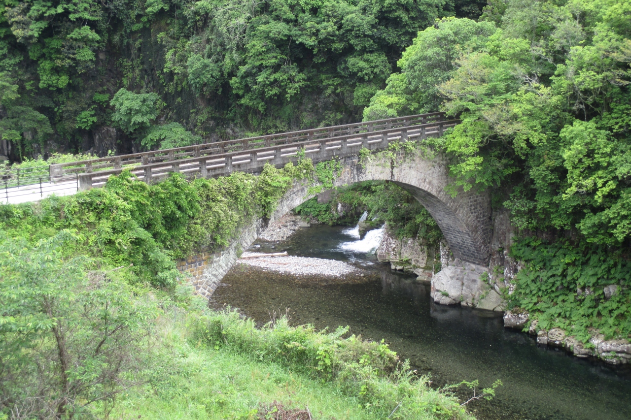 上流側の高いところに架かる轟橋は1934年(昭和9年)に森林鉄道の軌道橋として架けられた2連アーチ橋です。長さは68.5mで、水面からの高さは27mです。右岸側のアーチの径間32.1mは石橋日本一の長さを誇ります。右岸側の橋の袂辺りの柱状節理が2016年(平成28年)の熊本地震で崩壊し、修復されていますが痛々しい感じがしました。なお、現在は当時の橋の両側を若干拡幅して市道として利用されています。