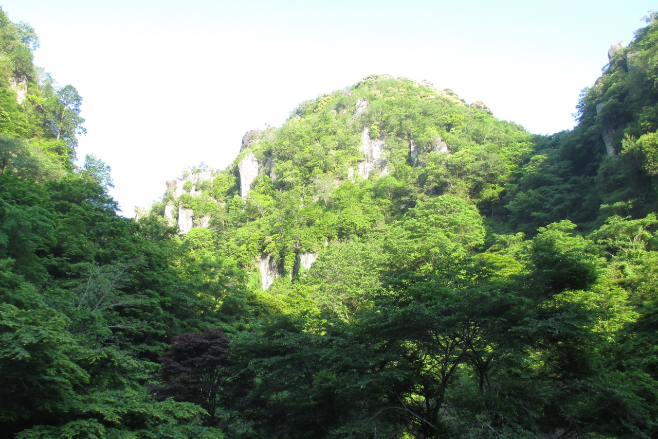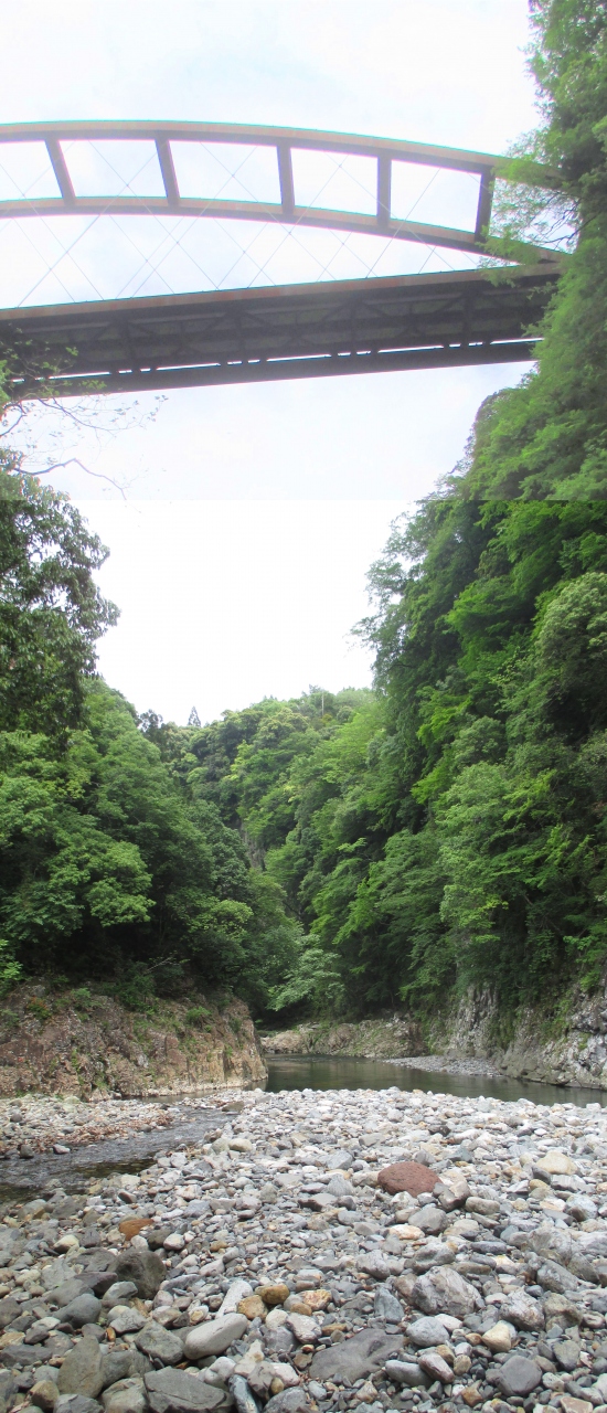 滞迫峡公園近くの奥嶽川は、浅く、細い流れで、通常はこんなに大人しい流れなのかと、妙に感心してしまいました。滞迫峡は深さが70mを越えるという、柱状節理が発達した溶結凝灰岩の岩壁を、間近に見ることが出来ました。といっても、意外なほど木々が茂っていました。これらの岩壁は阿蘇火山の9万年前に起きた4回目の大噴火による火砕流に因るものだということです。川底の岩盤は1500万年の噴火のよる凝灰角礫岩が露出しているのだそうです。話が古すぎてピンとは来ませんが、自然の創り出す芸術はスケールが違います。峡谷の上には、2001年(平成13年)に架けられた奥嶽橋が見えます。水面からの高さは70m、橋の長さは170mあります。