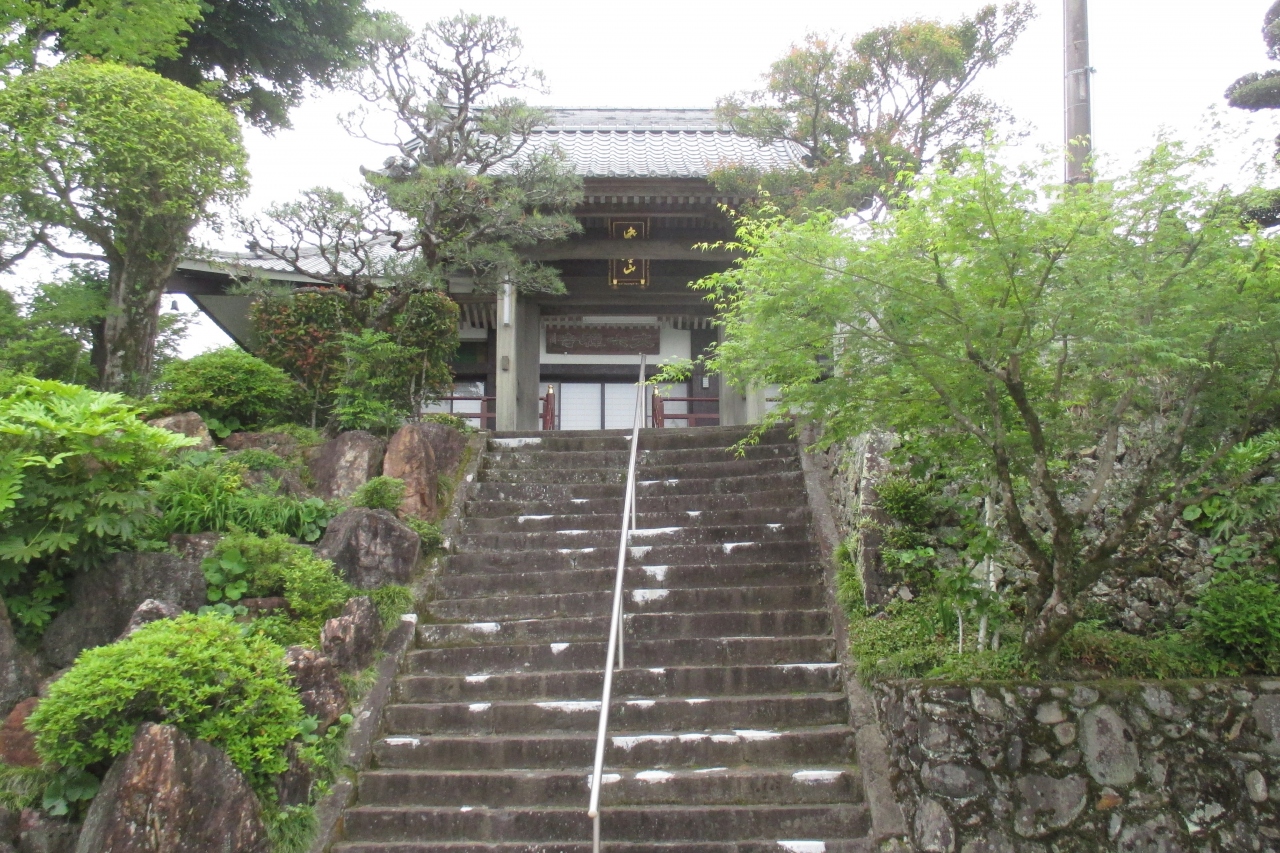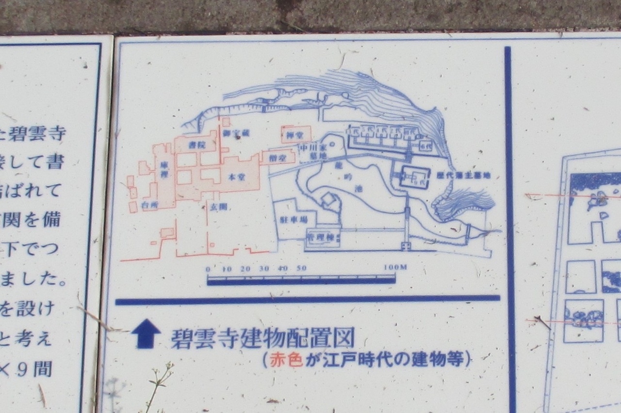 岡藩主おたまや公園の隣に、藩主中川家の菩提寺である碧雲寺がありました。1612年(慶長17年)に初代藩主・中川秀成がお茶屋の建設を進めていましたが、完成を待たずに急逝してしまい、2代藩主・久盛が菩提寺として完成させたそうです。現在は、普通の大きさのお寺さんですが、元はお隣のおたまや公園も、中に包含した大きなお寺さんだったのです。一般の拝観は認めていませんので、山門から覗くと、大きくはない妻入の本堂が見えましたが、横の駐車場に廻ると、奥行きの長~い建物でした。もとは庫裏の建物だったそうです。なお、山号は龍護山で、臨済宗妙心寺派のお寺さんです。