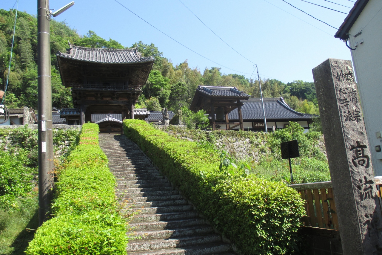 稲葉川沿いのこの一帯は藩主中川家関係のお寺などが集まっているところです。三日月岩の少し手前にその1つ高流寺がありました。駐車場もあるのでついでに寄るには便利です。この高流寺は2代藩主の中川久盛が禅の師匠である桐谷禅師のために開基したものです。石段を上がった高台にありました。1622年(元和8年)の創建です。すっきりとした印象の本堂がありました。1796年(寛政8年)に再建されたものだそうです。こちらには、2代藩主の墓塔を覆っていた覆屋を移設した金神堂があるとのことですが、どこにあったのか見損なってしまいました。なお、山号は龍寶山で、臨済宗妙心寺派のお寺さんです。