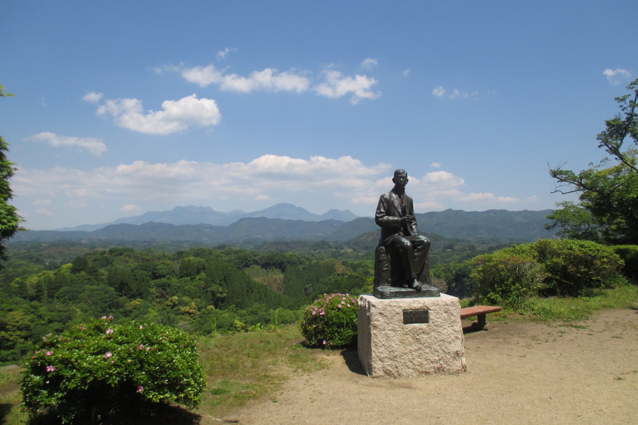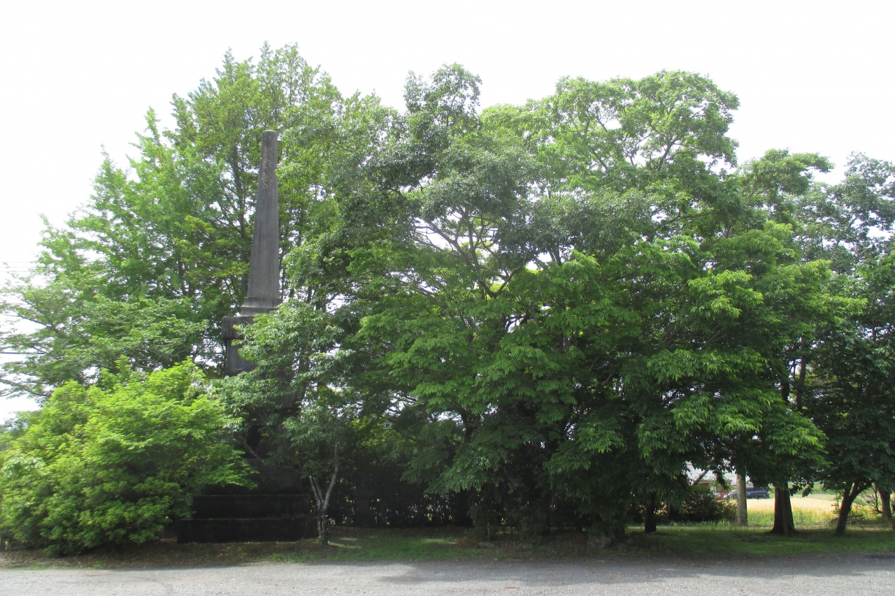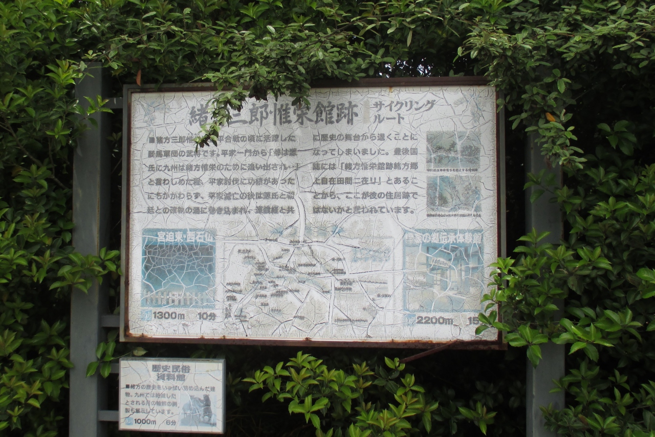 緒方三郎惟栄館跡は、国道502号線が軸丸川に架かる三郎橋の袂にありました。ここには1937年(昭和12年)に建立されたという高くて大きな「緒方三郎惟栄館趾之碑」がありました。ここは自然を利用した要塞で、南には緒方川が、東には軸丸川が流れ、西側は堀を築いていたので、周囲をがっちりと固めていたことになります。緒方惟栄は源平の争いの中、時代の変化を読んで、平家から源氏に乗り換え、源氏勝利の貢献大だったのですが、義経に付いた(付けさせられた)ところから、一気に時代から消え去ってしまったのですね。