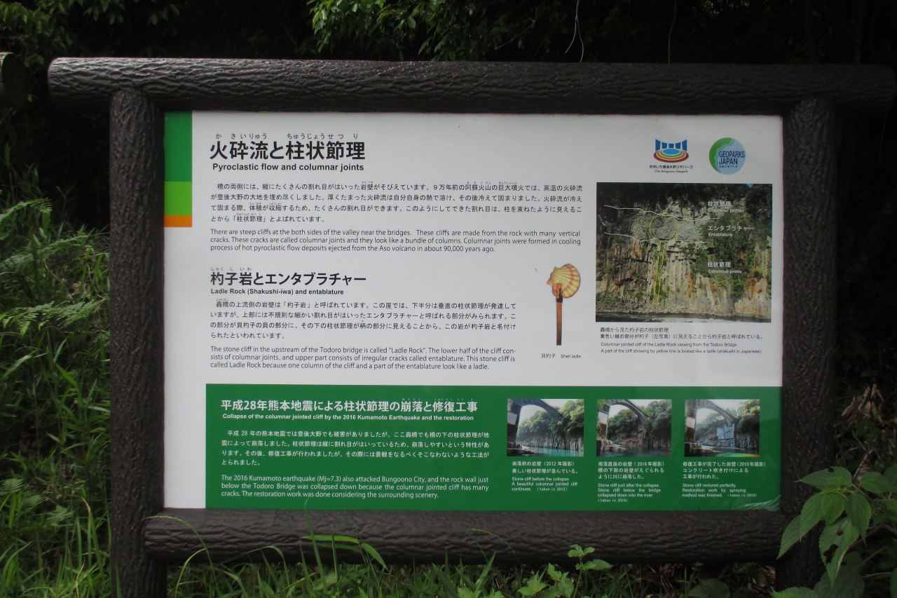 轟橋の上流側には杓子岩と名付けられたところがあります。阿蘇山の9万年前の大噴火による溶岩凝結岩が大きく露出しています。下部は柱状節理ですが、その上は細かい岩が重なっている様に見えるエンタブラチャーになっています。なお、案内板に書かれているエンタブラチャーの和名が見付かりません。余計なことですが、柱状節理に対抗して「塊状節理」とでも呼んでおきましょうかね。想像力豊かな人が両方合わせて見ると、貝杓子の様だということから、この岩名が名付けられたそうです。- 旅行時期
