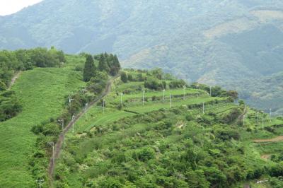 地下(じげ)の茶山展望所は海岸沿いを走る県道122号線から、山側に逸れて登っていったところにありました。世の中にはいろいろな選定がありますが、2008年(平成20年)に朝日新聞社が行なった「日本の里100選」に北浦が選ばれたそうです。北浦が選ばれたのは、海の里であり、また、茶の里でもあることでした。地下の茶山がその茶の里で、茶山展望所から眺めると、山肌広範に茶畑が拡がっていました。ここには早生品種の「さえみどり」「さきみどり」などが栽培されているそうです。訪れた5月では2番茶、3番茶の摘み取り時期なのかと思いました。