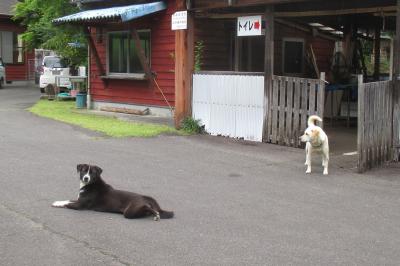 藤河内渓谷の千枚平から県境近くの国道326号線へ戻る途中で藤河内湯~とぴあに寄りました。千枚平から約3kmのところに案内板がありました。途中、桑原川を渡りましたが、右手はちょっと下流にある小さな藤河内ダムによって作られたダム湖、左は流れ込む渓谷でした。程なく、藤河内湯~とぴあに到着しましたが、吠えながら元気よく犬が飛び出してきました。来客を報せているのかな?