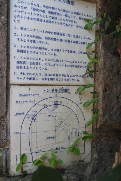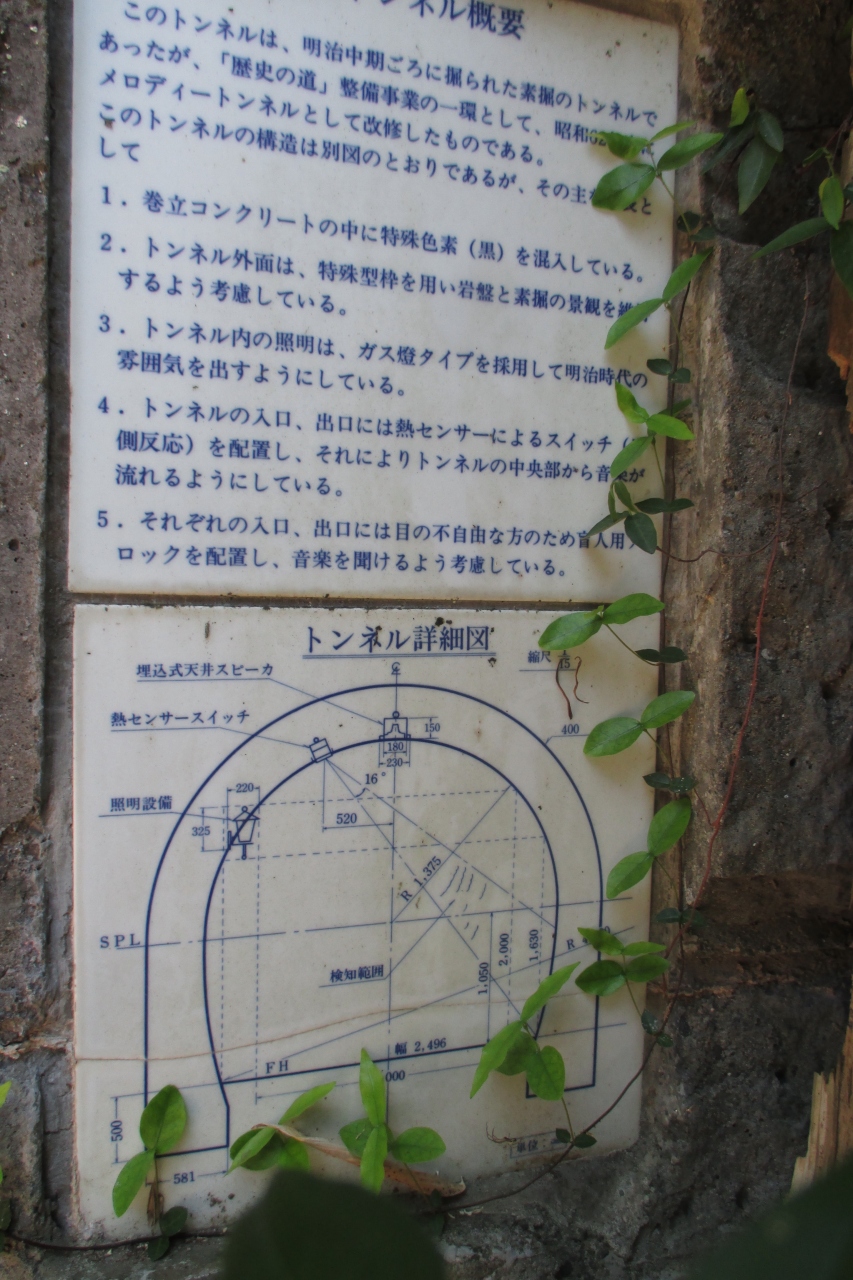 廉太郎トンネルは、瀧廉太郎記念館の近くの路地の奥にありました。幅は2.5mで、長さは15mほどです。正式名は溝川隧道といい、1879年(明治12年)に完成したもので、その元は江戸時代に酒蔵として掘られた岩窟だったそうです。当然、元は素掘りで、1987年(昭和62年)に観光用に改修したそうです。廉太郎トンネルの命名は瀧廉太郎記念館のオープンに合わせたとのことですから、1992年(平成4年)のことだったのでしょう。廉太郎が竹田に来たのは1891年(明治24年)ですから、その当時にはすでにあった溝川隧道は何度も通ったことでしょうね。