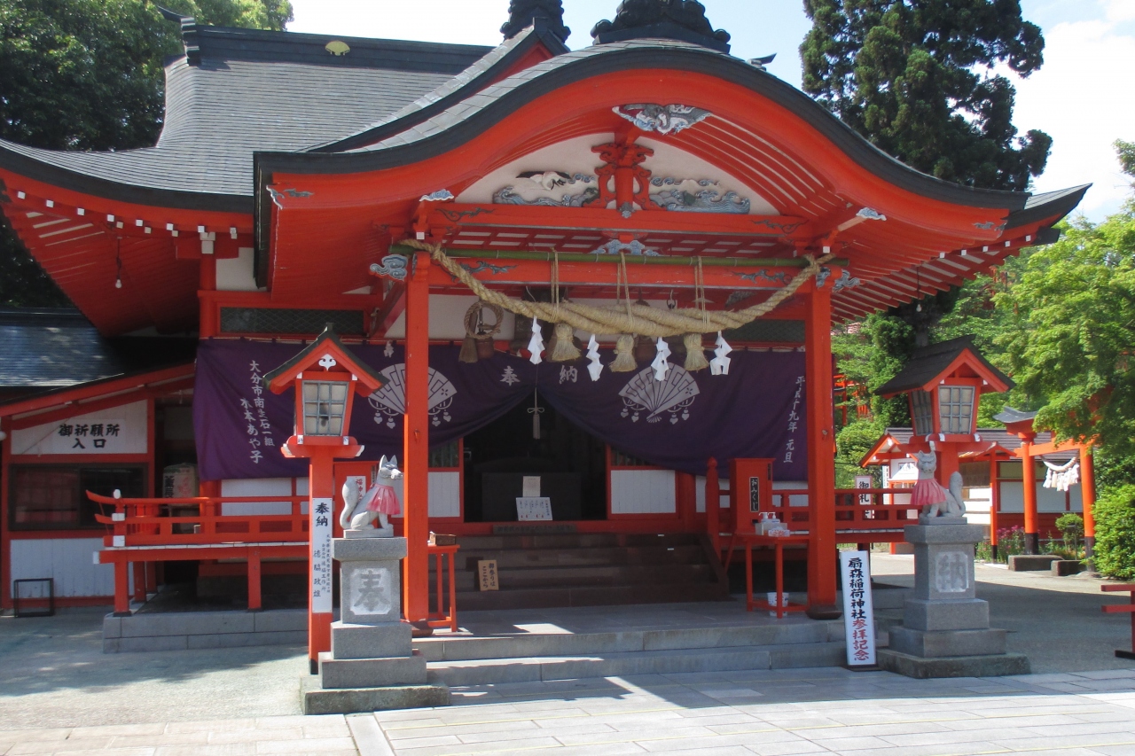 扇森稲荷神社は、国道57号線から参道が始まっていました。場所は拝田原という地区です。ここには古墳があることから古くから祭祀が行われていて、それが神社としての始まりではないかとみられていますが、稲荷神社としての創祀は1616年(元和2年)とされ、後に、岡藩主から「扇の森」の社号を頂いて、扇森稲荷神社となったとのことです。(創祠400年の記念碑が建っていました)地元では長い社名ではなく、「こうとうさん」と親しく呼ばれているそうです。諸説があるそうですが、もっともよく知られているのは、岡藩の藩士がここに白狐の頭を埋めたことから狐頭原(こうとうばる)と呼ばれるようになり、今では、狐頭様(こうとうさま)と通称されているのだというものです。