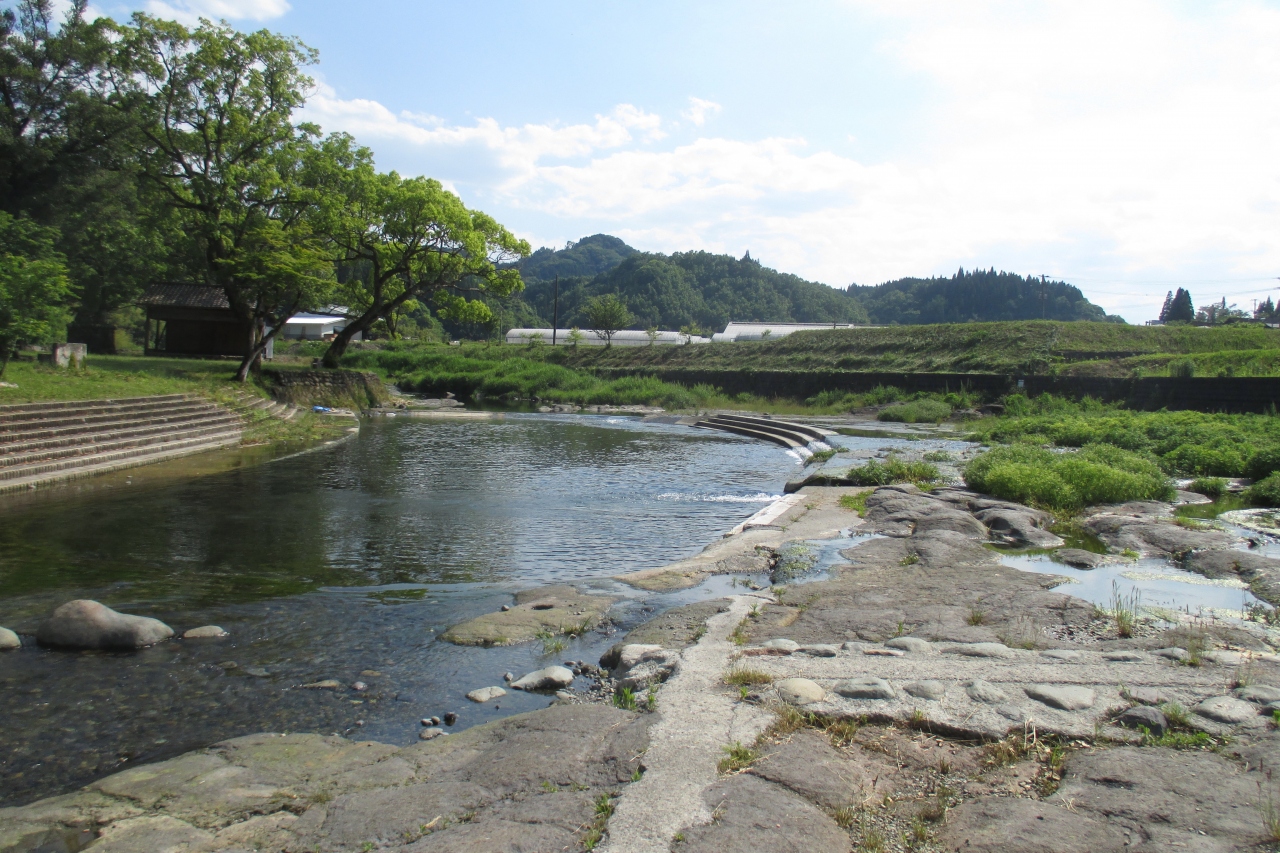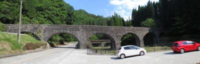 県道8号線を神原渓谷方面に進んでいると、6連の石造アーチ橋がありました。見た目にがっしりとした明正井路一号幹線一号橋です。明正井路は竹田から遠く豊後大野まで引かれた用水路です。1917年(大正6年)に着工し、1924年(大正13年)に完成したものです。(昭和に取水の追加工事がされています)総延長は175kmもあり、起伏が激しいため17基の水路橋が築かれたとのことです。この橋は別名では明正井路第一拱石橋とも呼ばれていますが、大野川水系の緒方川と県道8号線に架かっています。幅員は2.8mで、長さは78mもあり、大分県内では最長です。6連のアーチの上には水路として4段の石壁が積まれていました。