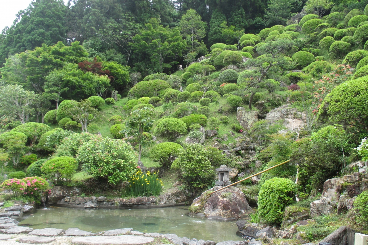 浄運寺は豊後大野市の中心となる三重町から少し南のところにありました。1603年(慶長8年)に創建と伝わるお寺さんです。立派な楼門が迎えてくれました。こちらでは裏山の斜面を使ったツツジ園が有名です。急な山肌がきれいに剪定されたツツジで埋まっていました。ここには約200本があり、樹齢も200年を越える様なものも多いそうです。奥様のご説明によると、何種類かのツツジが開花期をずらして咲くので、長く楽しめるとのことでした。訪れた時はもう最終盤だとのことで、辛うじて何本かが花を付けていました。なお、山号は西臺山で、浄土宗のお寺さんです。