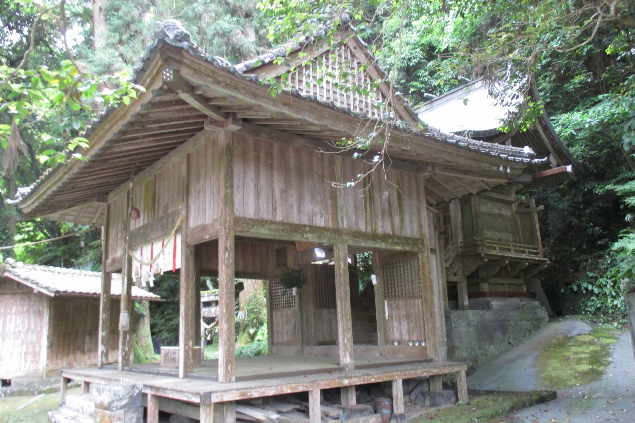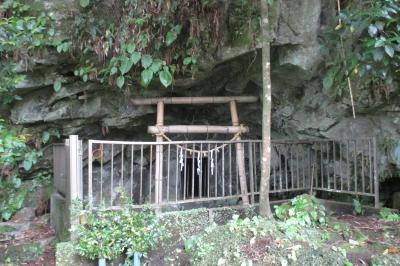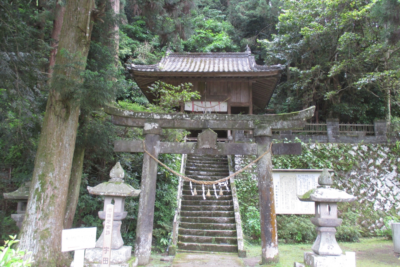 宇田姫社は、県道45号線沿いの、三玉という地区にありました。ここは平家物語にも登場する豊後おだまき伝説の宇田姫が暮らしていたとされるところで、ご祭神は宇田姫の本名である華ノ本とされています。拝殿から左に移動すると、ご神体とされる小振りな洞窟がありました。これは竹田市の神原にある穴森神社のご神体である大蛇が棲んでいた洞窟と繋がっているのだそうです。なるほど、きちんと伝説のお話が繋がっているのですね。洞窟からはご神水が湧き出ていました。拝殿の右にヤブツバキの立派な御神木がありました。自生していたとみられるそうで、胸高直径が55cm、胴回りが183cm、樹高は8mですが、落雷で幹の途中が折れています。
