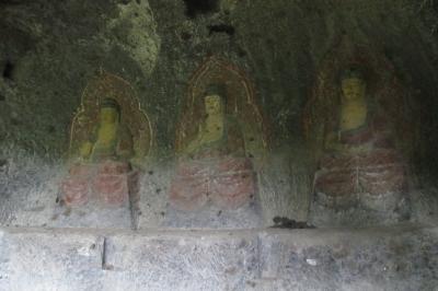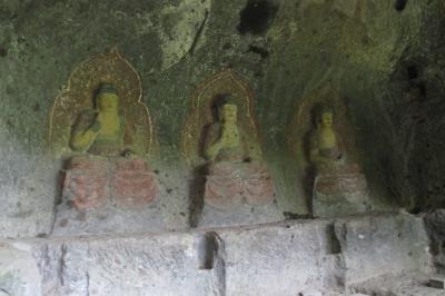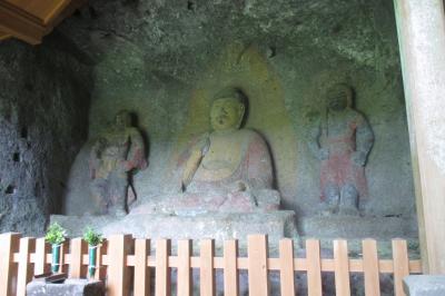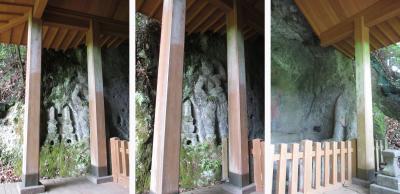 緒方宮迫東石仏は、市道?横にある駐車場から150mくらい坂道を上がっていったところにありました。中央に如来坐像があり、向かって左に天部が、向かって右には不動明王が従っていました。中央の如来は現在は大日如来とされていますが、以前は薬師如来だった歴史があるそうです。左の天部は、毘沙門天あるいは持国天とみられるそうです。全体に素朴な感じの像です。さらに左右の外側には形の崩れた金剛力士像がありました。平安時代末期の作と見られるそうです。また、向かって左の大外に2基の宝塔が刻まれていますが、これは室町時代初期の作とみられるそうです。