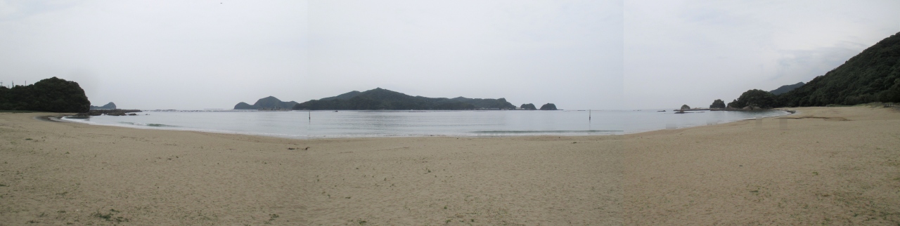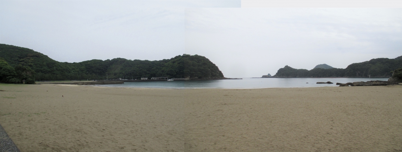 熊野江海水浴場は国道388号線から逸れて熊野江川を渡った先にありました。その熊野江海水浴場は、寸胴の様な形の熊野江湾の奥にありました。湾の先には三角錐型が特長の立礁が望めました。緩くカーブを描いて、800mくらいの長さがあり、奥の方には草もありますが、奥行きは100m近い広々とした浜辺です。湾は穏やかですが、浜辺らしい小さな波が打ち寄せていました。