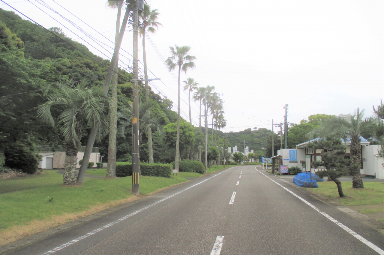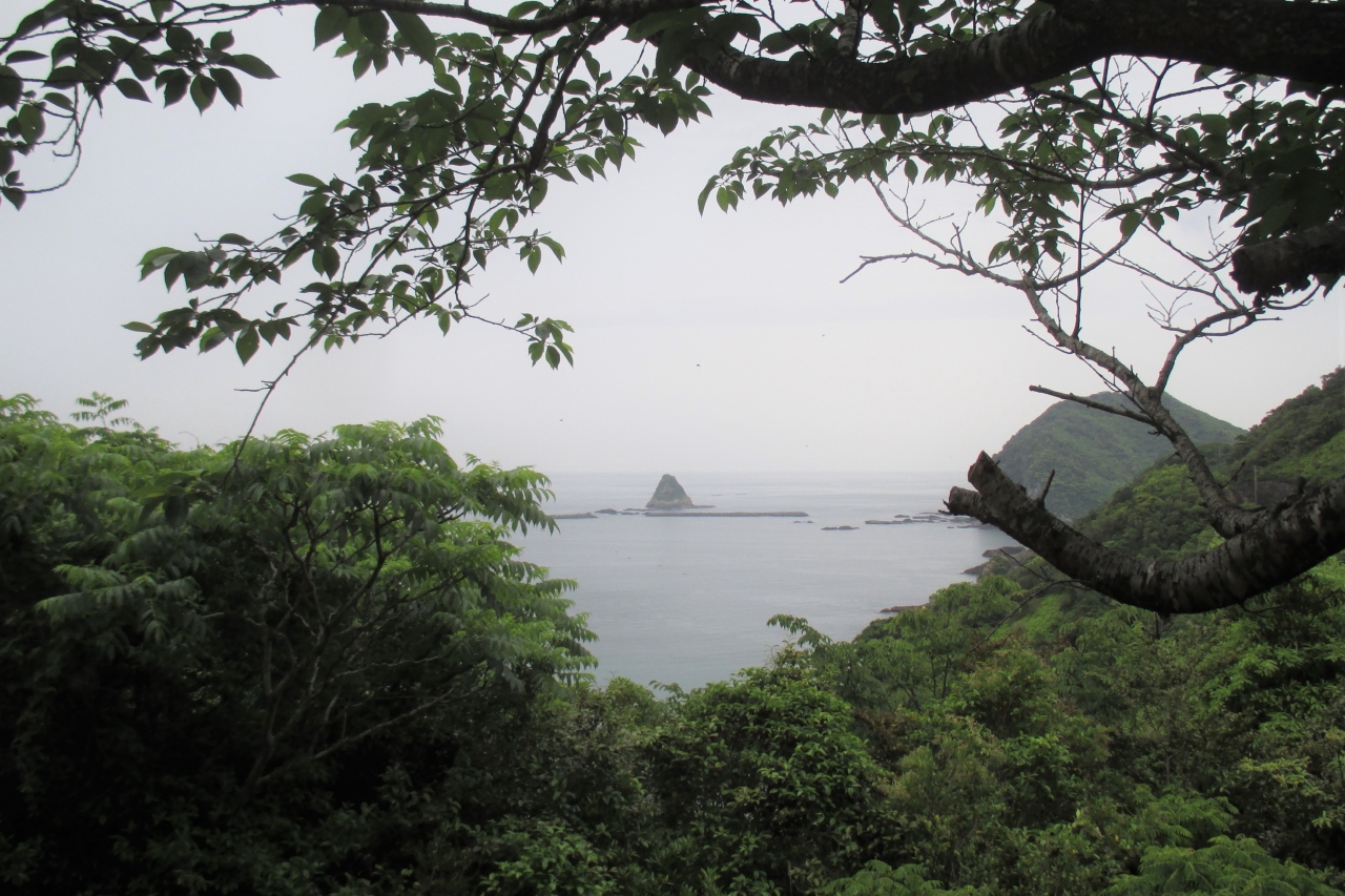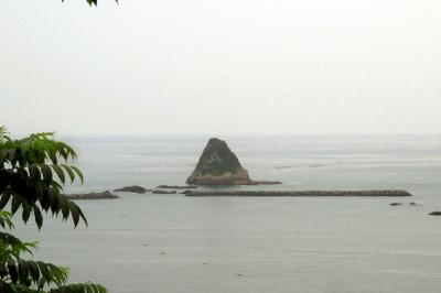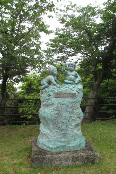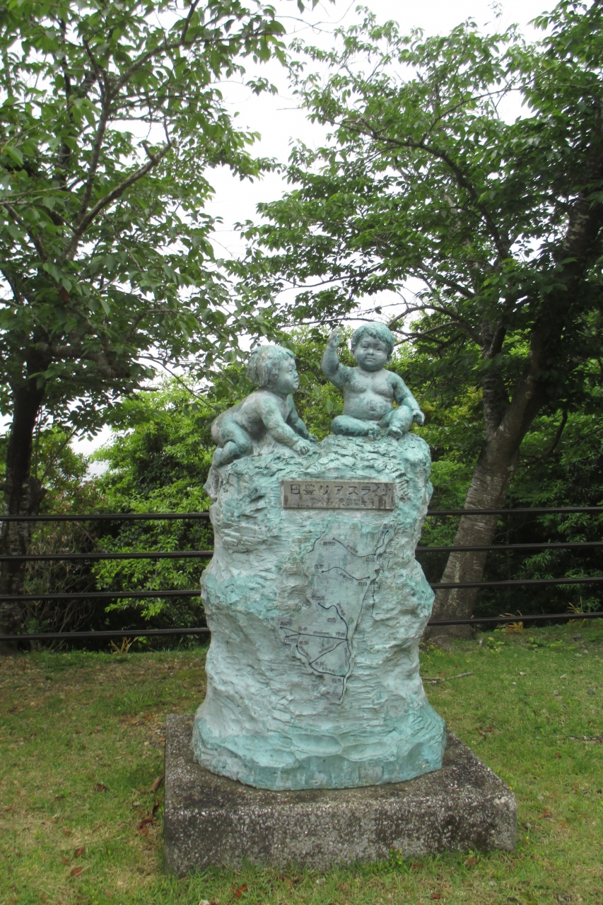 七ツ島展望所は、須美江家族旅行村の西端から旧道を進んだところにありました。展望所という割りには、周りに木々が多く、展望が良いとは言えません。また、七ツ島という島が見える訳でもありませんでした。先端方向を見ると、今まで何回か目にしてきた、特徴的な形をした立礁が見えました。その右横の磯場は二子礁ではないかと思います。展望所の一画に、天使の様な赤ちゃんが2人乗った石碑がありました。近付くと、宮崎県愛称ロード「日豊リアスライン」の記念碑でした。国道388号線に付けられた愛称ですが、今は内陸部を真っ直ぐに突き抜けています。