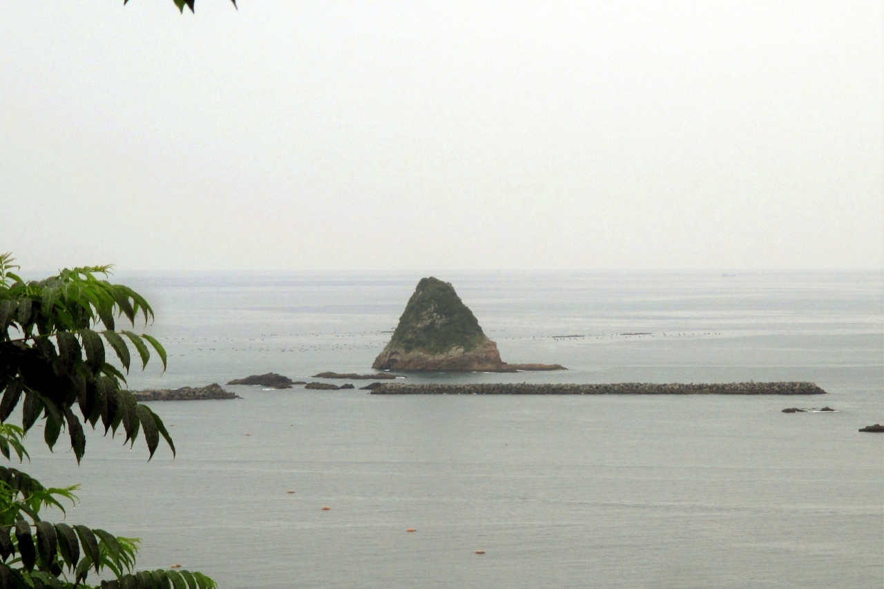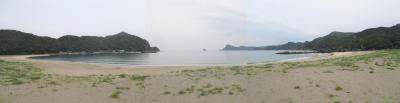 高台にある道の駅・北浦から見ると、広々とした砂浜が見えました。緩くカーブを描きながら1km近い長さと、50mくらいはありそうな奥行きがありました。浜辺に降りると、穏やかな波が寄せていました。沖100mくらいのところに何本かのポールが立っていました。砂浜を守る様に人工リーフが沈められている様です。沖合6km先に浮び、前面を塞ぐ様に拡がっている島浦島も消波の効果も大きいのでしょう。