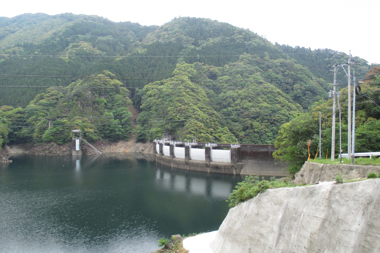 北川ダム湖は、大分県から宮崎県へと流れている北川(水系としては五ヶ瀬川水系に属しています)の、大分県側に築かれた北川ダムで生まれたダム湖です。この北川の特長は標高差の少ないことです。従って、ダム湖は異常に長く、ダムから上流6~7kmまで続いています。5月に訪れましたが、梅雨の前だったので、水面から上に岩肌がかなり見えました。ダム堤のところを海抜で見ると、可動堰の下は154.5mとのことです。可動堰の高さは6.5mほどですから、現在の水位は148.5mくらいでしょう。通常時の満水位160.5mですが、利水最低水位は131.0mだそうで、意外なほど高いですねぇ。そうするとダム湖の貯水率ですが、単純比率では計算出来ませんが、ダム湖の長大さを考えると30%台だと思います。取り敢えずは発電可能水位は保っているのだと思いました。