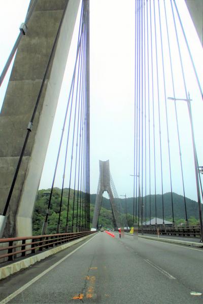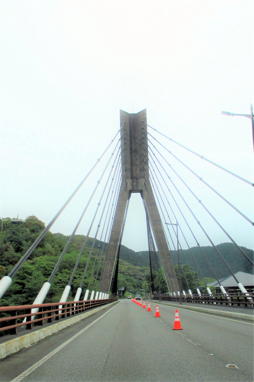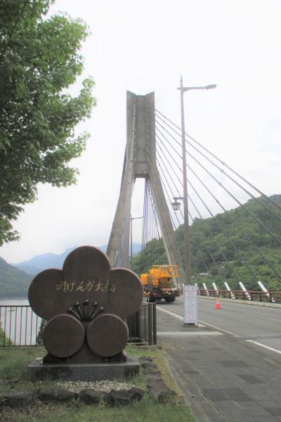 唄げんか大橋は国道326号線に架かっていました。支流の中岳川が本流の北川に合流する地点で、現在は北川ダム湖を跨いでいます。1993年(平成5年)に完成した橋です。周りは自然に囲まれたところですが、高さが64.5mもあるという逆Y字型の2本の主塔が、その自然の中で、天に向かって突き抜けていました。名前の由来は、この地に伝わる民謡「宇目の唄げんか」からだそうで、国道326号線の県境近くにある桑の原トンネルの南側の入口には子守娘の姿がありました。なお、北側の入口は藤河内渓谷の絵でした。