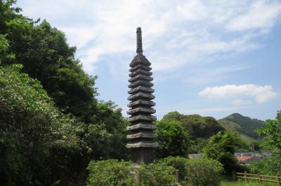 十三重塔は八迫区というところにありました。世の中にはたくさんの十三重塔がありますので、ここのものは上岡十三重塔と呼ばれている様です。総高は8.5mありますから、見応えがあります。造立は鎌倉時代と推定され、この地の豪族だった佐伯氏一族のどなたかの供養塔とみられるそうです。佐伯氏の居城だった栂牟礼山城跡はこの塔の北方ですから、支配地の中心近くとなります。この塔は個人の所有になっています。元は近くの丘にあり、1951年(昭和26年)のルース台風で倒壊しますが復原されたそうです。。その後、1968年(昭和43年)に土地造成に伴い、現在地に移設されたとのことです。なお、ここには駐車場がありませんでした。