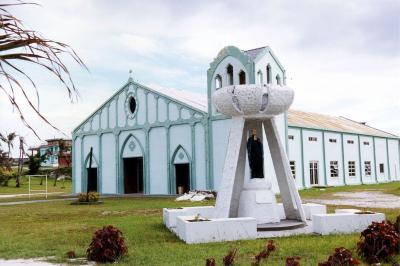 サンフランシスコ・デ・ボルハ教会は、ソンソン村の中心にあありました。ロタ島にある唯一のカソリックの教会とのことです。ファサードもない、淡いブルーのすっきりとした外装ですが、ロタ島がスペインの統治下にあった時代に建てられたとのことです。鐘楼の鐘が細長く見えましたが、どんな経緯があったのか、大砲の砲丸の筒なのだそうです。建物の前にタガ・ストーンの様なデザインの中に神父さんの像が置かれていました。功績のあった神父さんなのでしょうか。なお、建物の後方は墓地になっていました。